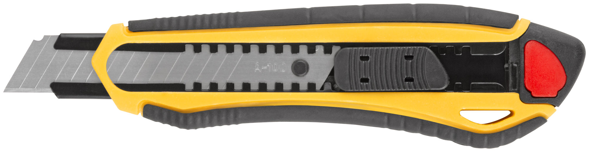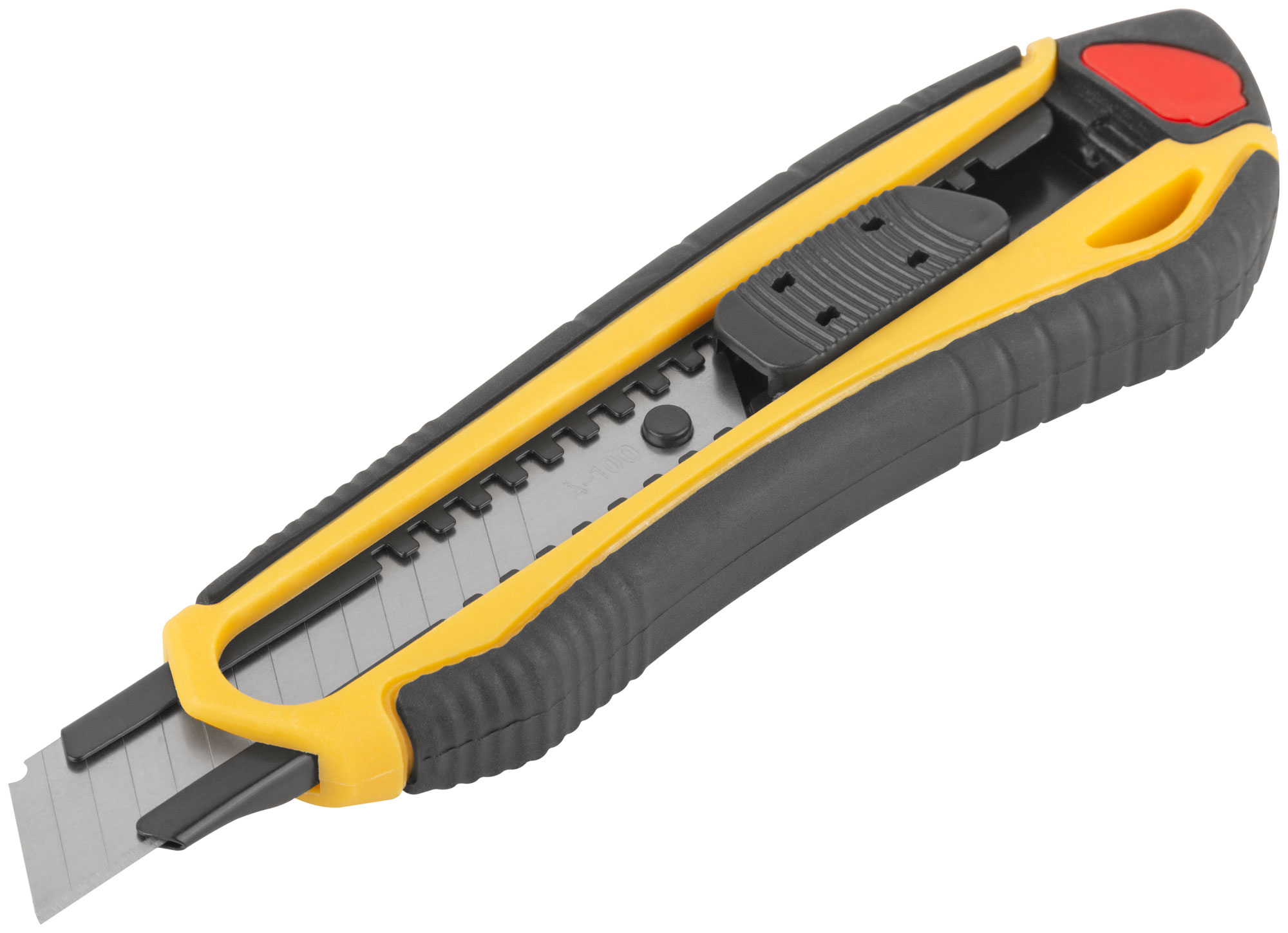 Корпус ножа изготовлен из ударопрочного ABS пластика с прорезиненными элементами, что обеспечивает надежный хват и предотвращает скольжение. Лезвие выполнено из высокоуглеродистой стали, что гарантирует долгий срок службы и качественную резку. Металлическая направляющая с двусторонней автофиксацией укрепляет конструкцию ножа, а встроенный отсек позволяет всегда иметь под рукой запасные лезвия.