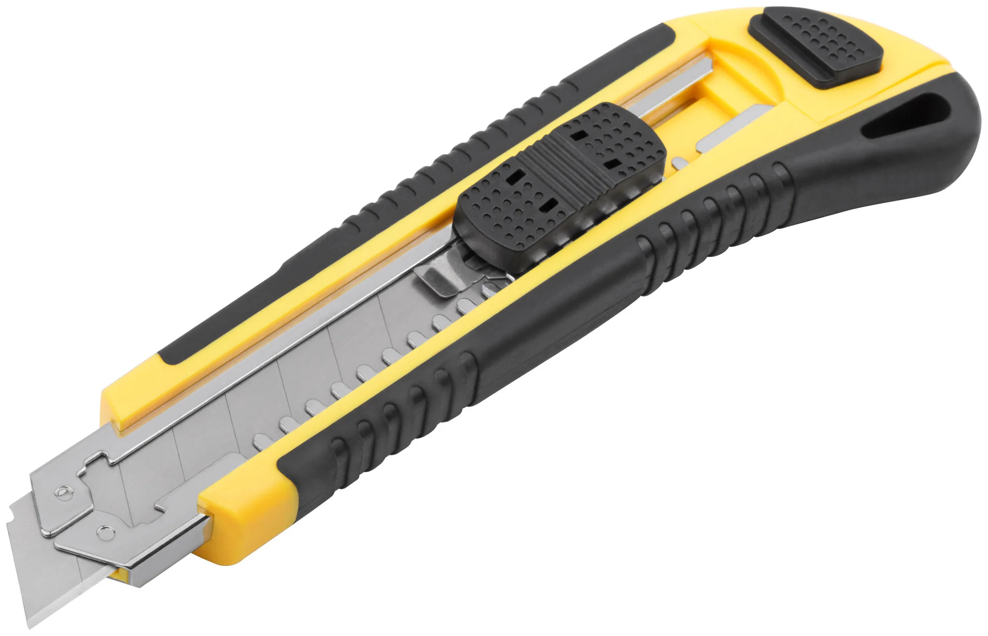 Этот нож изготовлен с использованием прочной металлической направляющей и прорезиненной вставки на рукоятке, что обеспечивает комфорт в использовании и предотвращает скольжение. Встроенная кассета с тремя запасными лезвиями позволяет быстро заменить лезвие без необходимости искать дополнительные инструменты.