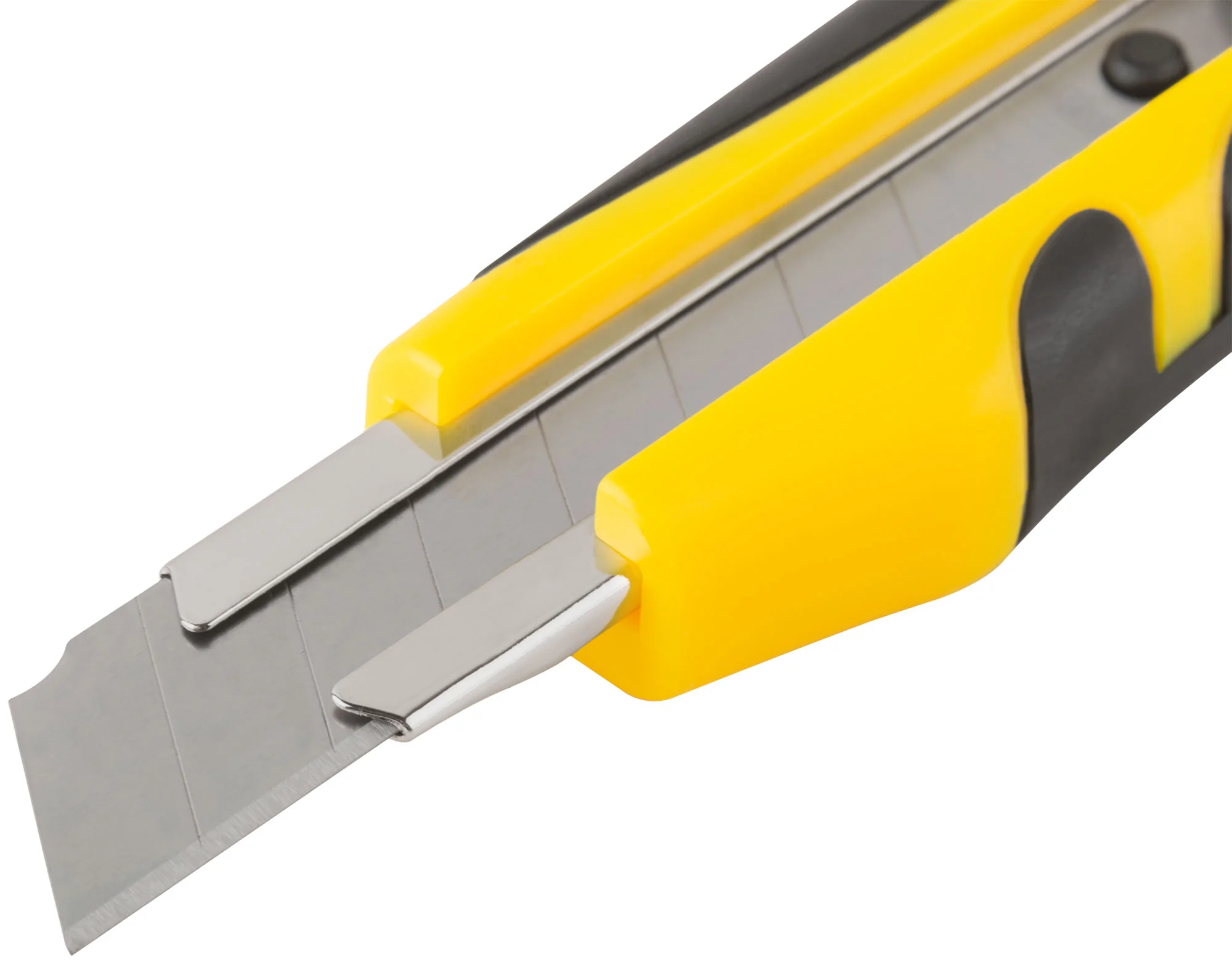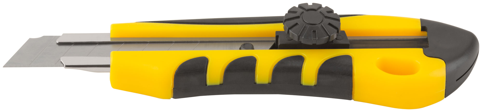 Корпус ножа выполнен из пластика с резиновыми вставками, что обеспечивает надежный захват и устойчивость в руке. Усиленная металлическая направляющая гарантирует долговечность и надежность при интенсивной эксплуатации. Вращающийся пластиковый прижим фиксирует лезвие, гарантируя безопасность.