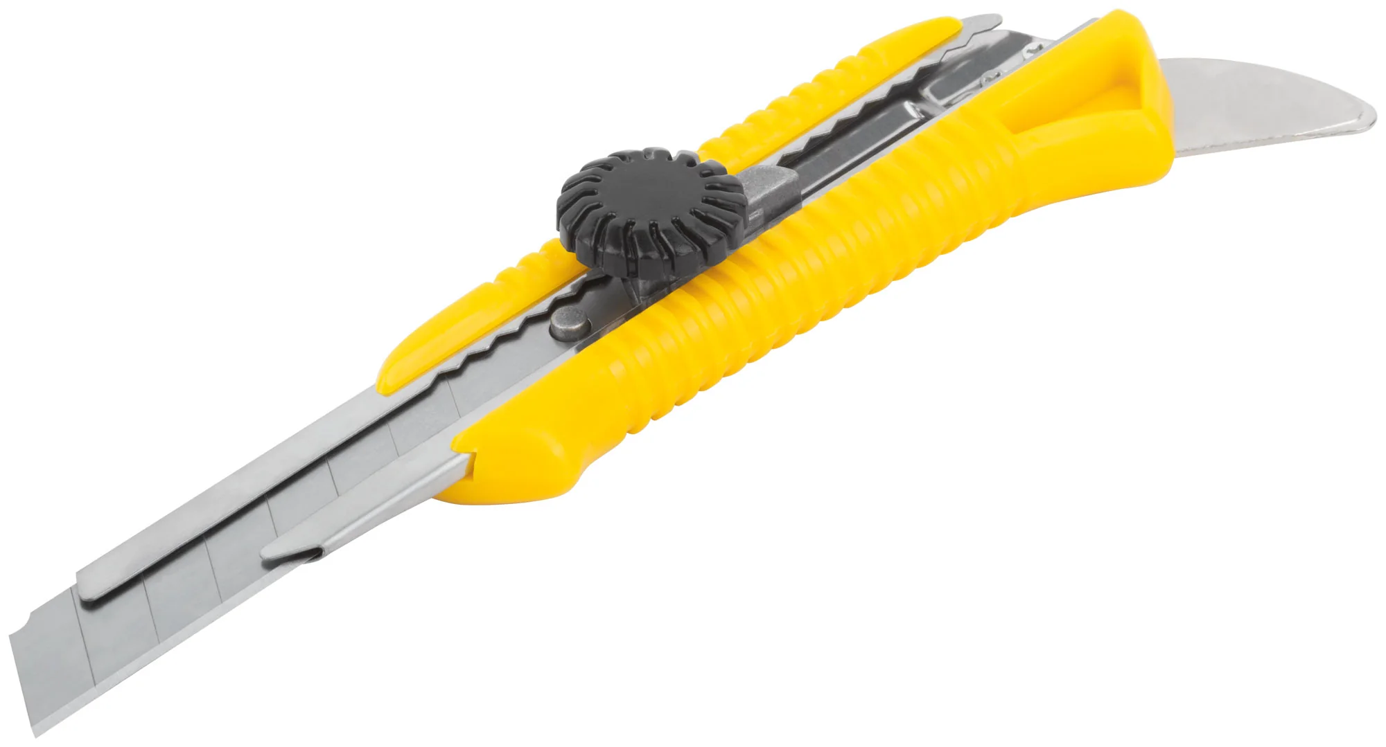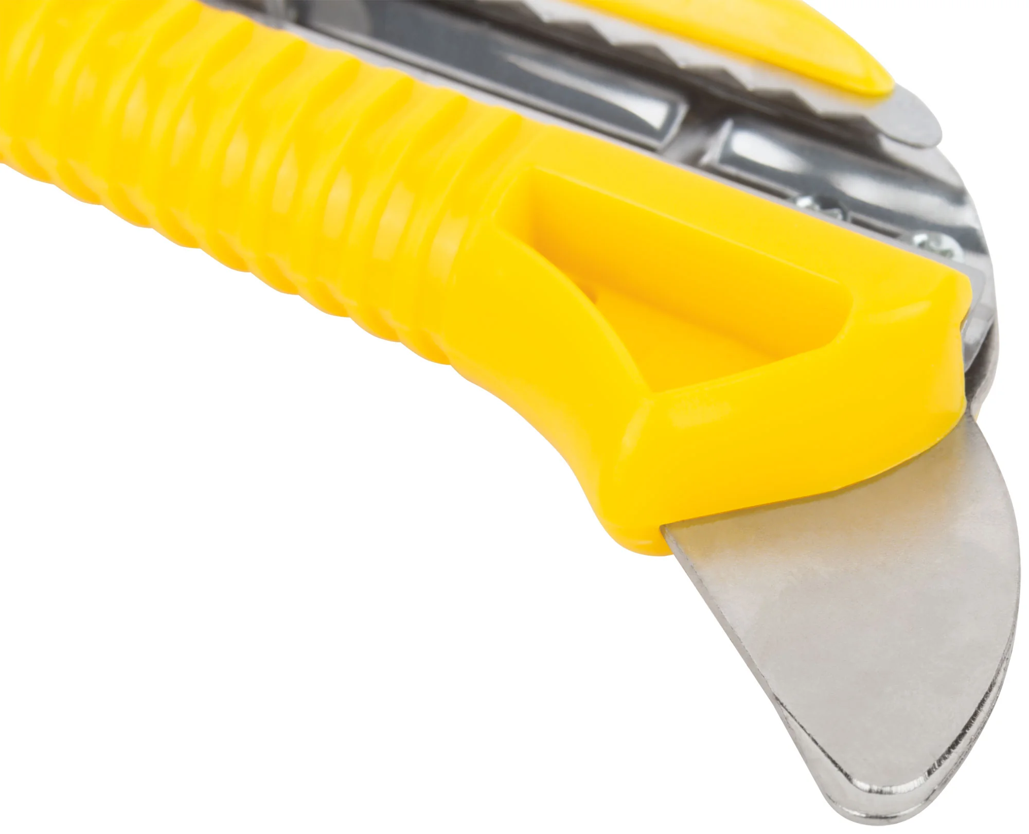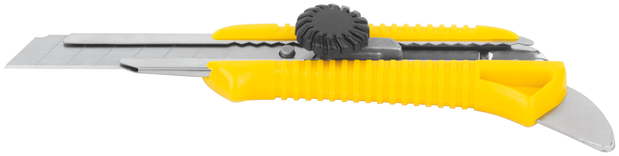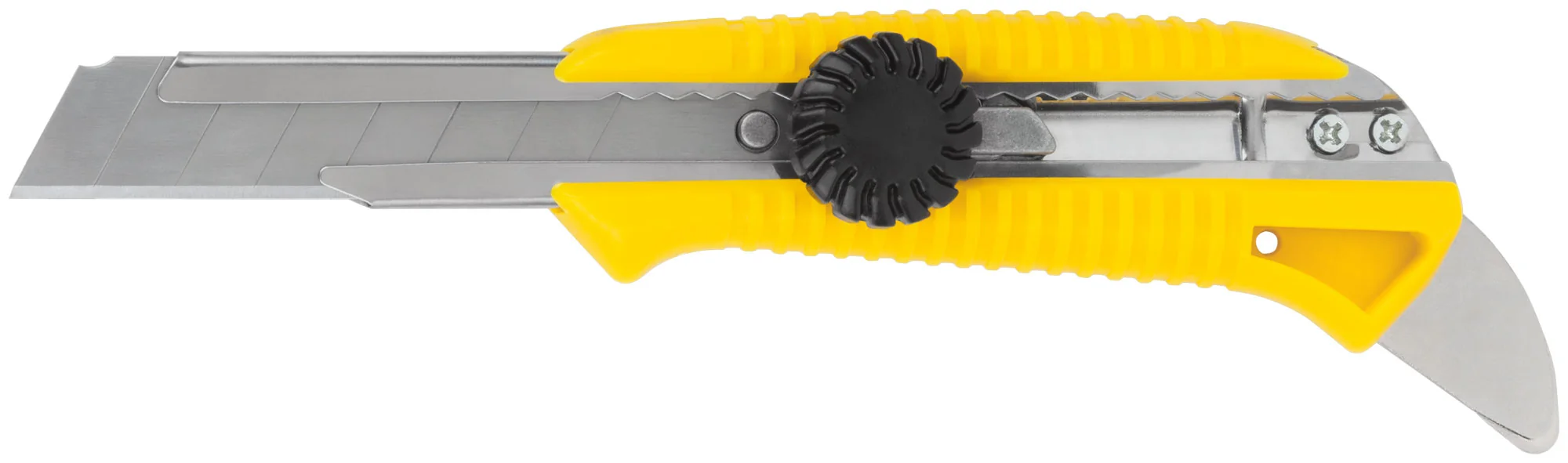 Этот нож оснащён вращающимся пластиковым прижимом для удобной фиксации лезвия и металлической пяткой для дополнительной функциональности. Лезвие выполнено из высокоуглеродистой стали, что обеспечивает его прочность и долговечность. Пластиковый корпус усилен металлической направляющей, добавляя конструкции надежность и устойчивость.