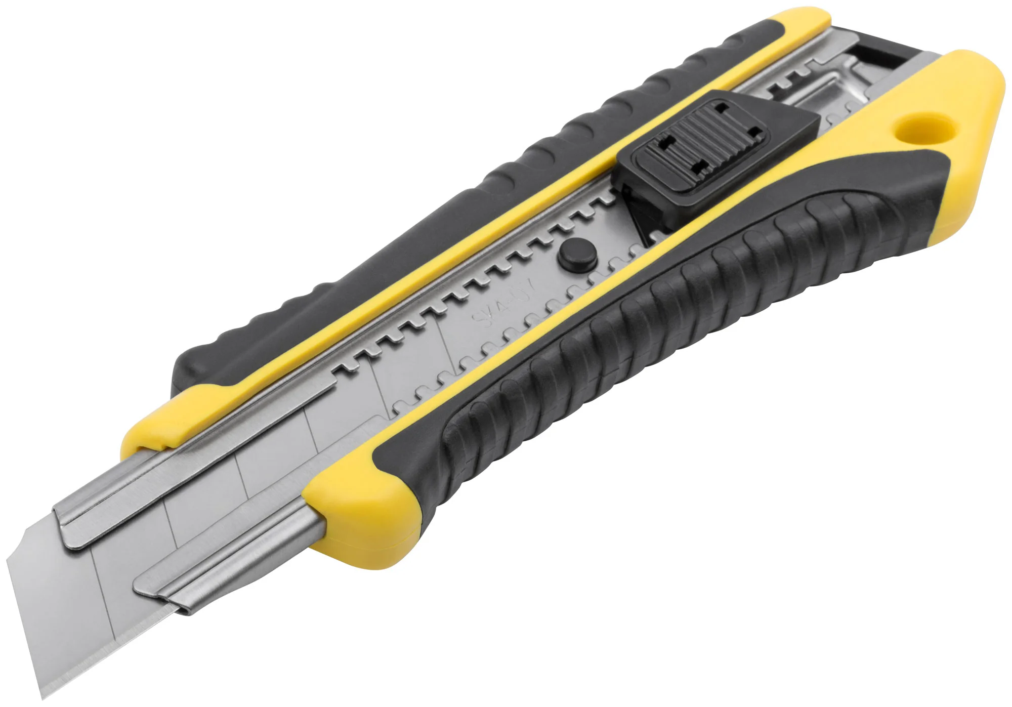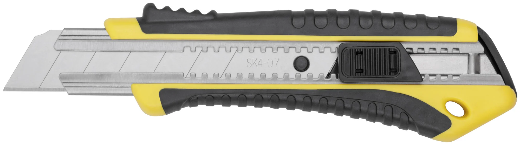 Этот технический нож незаменим для профессионалов в области строительства и ремонта. Его усиленный прорезиненный корпус обеспечивает надежный хват, что особенно важно при выполнении точных резов в сложных условиях. Нож идеален для резки различных материалов, от плотной бумаги до тонких пластиковых панелей.