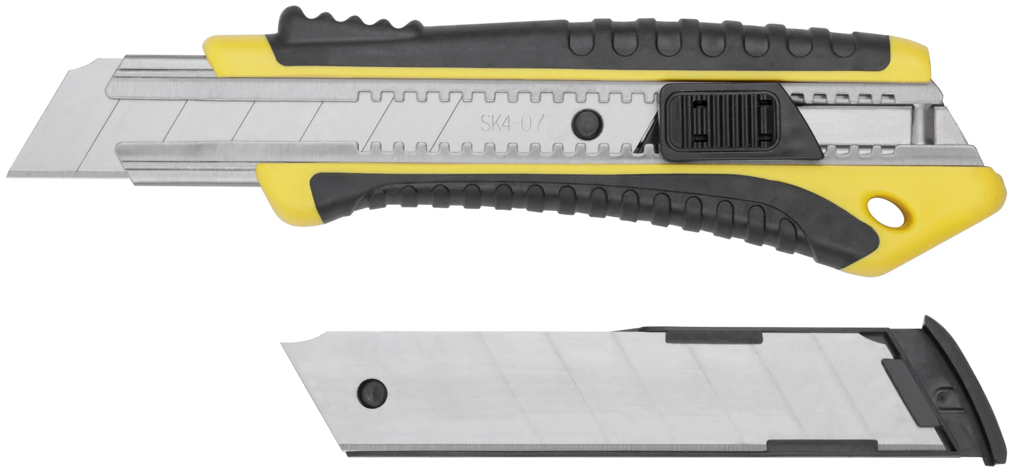 Конструкция ножа включает отламывающиеся лезвия из инструментальной стали, что позволяет быстро и легко обновлять режущую кромку без необходимости полной замены лезвия. Металлическая направляющая обеспечивает дополнительную прочность и долговечность инструмента.