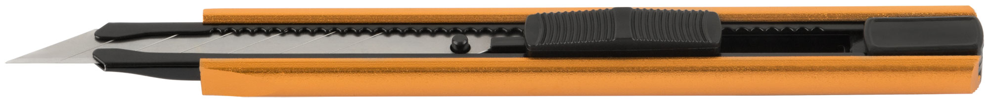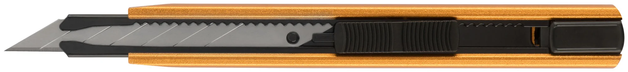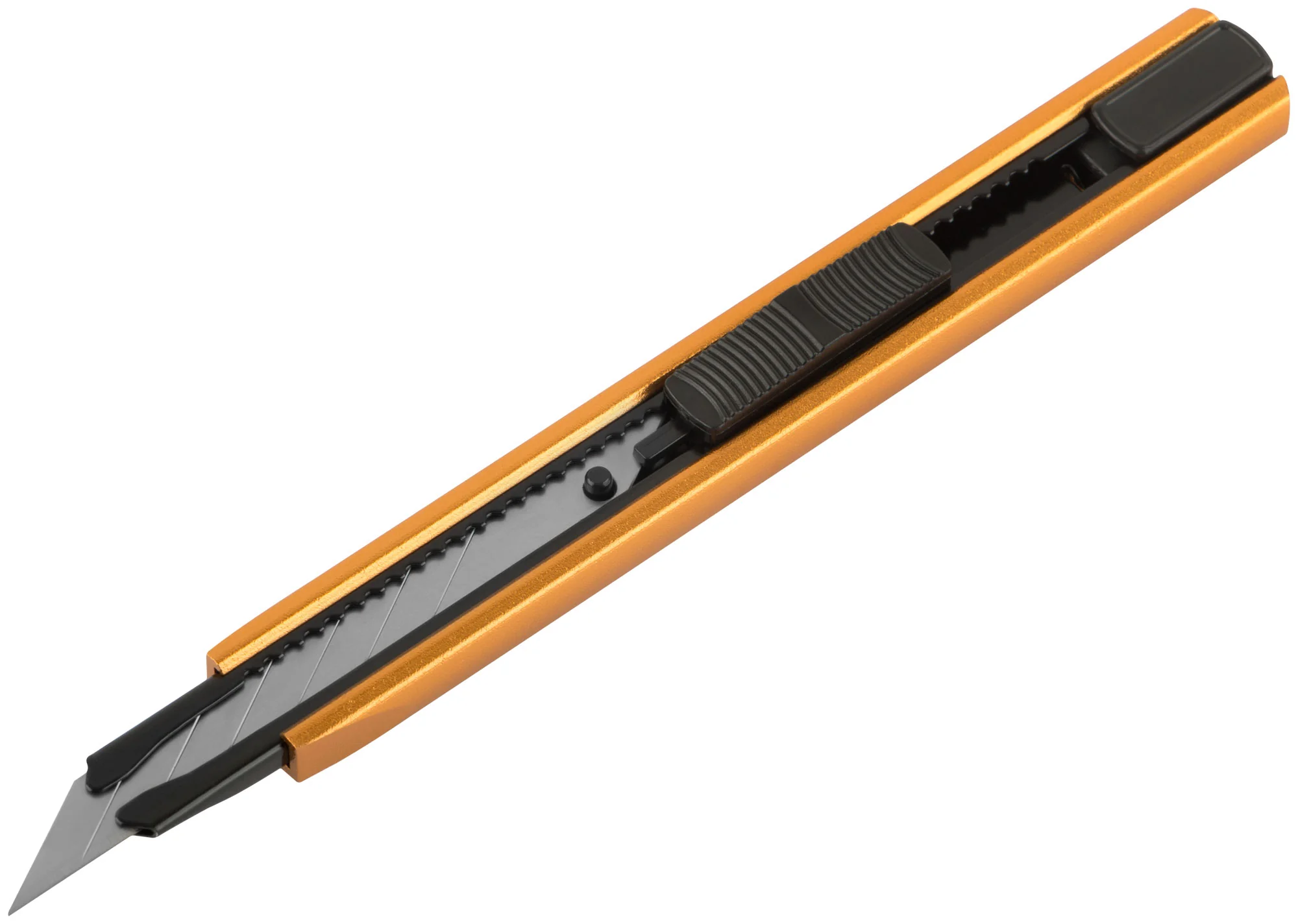 Конструкция ножа включает отламывающееся лезвие из высокоуглеродистой стали с пластиковым прижимом для быстрого и безопасного использования. Направляющая выполнена из инструментальной стали с черным оксидированным покрытием, а корпус изготовлен из прочного алюминиевого сплава, что обеспечивает долговечность и устойчивость к нагрузкам.