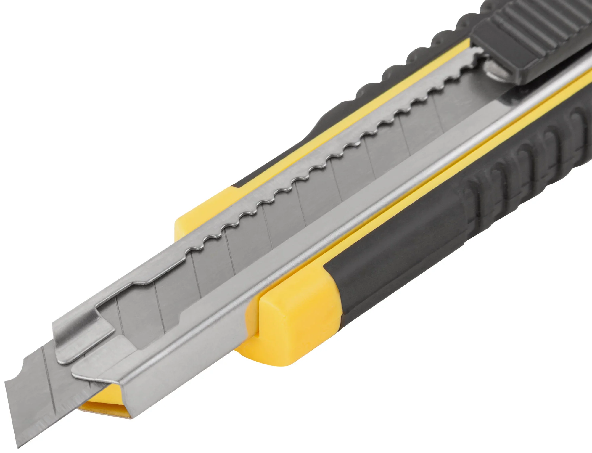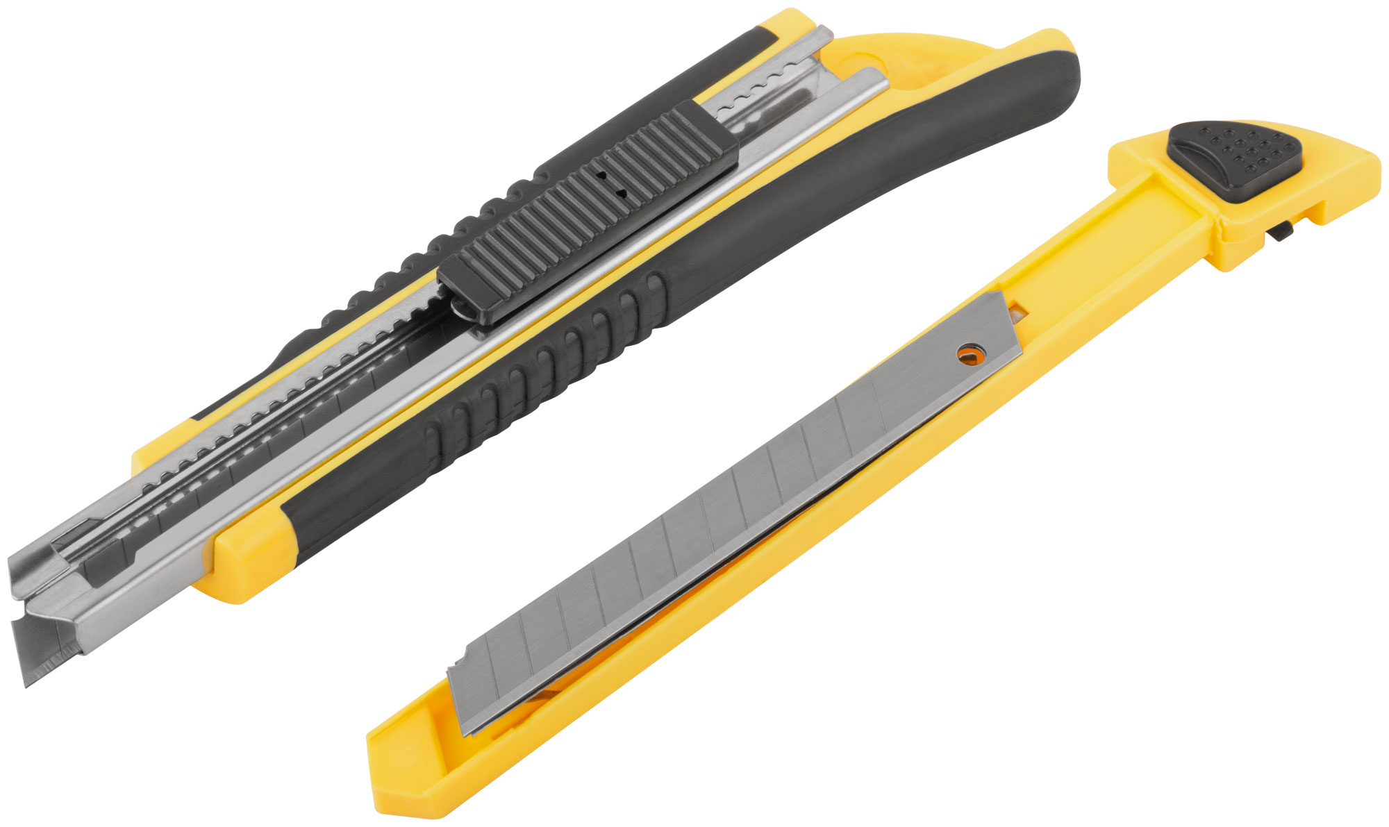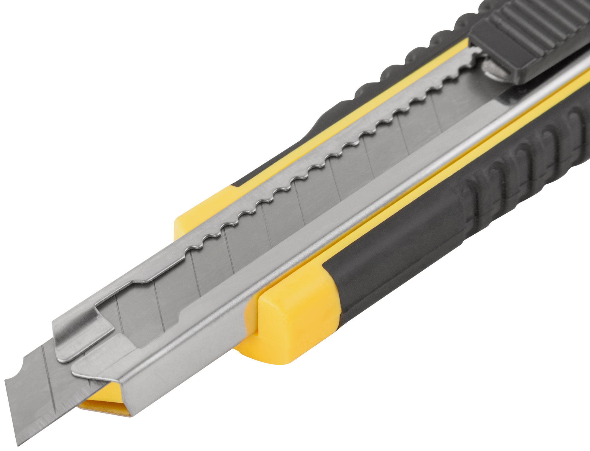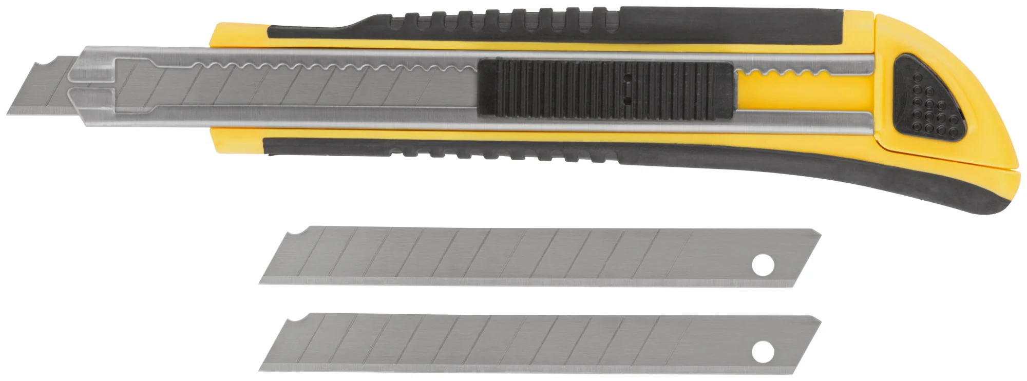 Нож оснащен лезвиями из высокоуглеродистой стали, что обеспечивает долговечность и остроту реза. Прорезиненный корпус выполнен из ударопрочного ABS пластика и усилен металлической направляющей, что делает нож устойчивым к механическим повреждениям.
