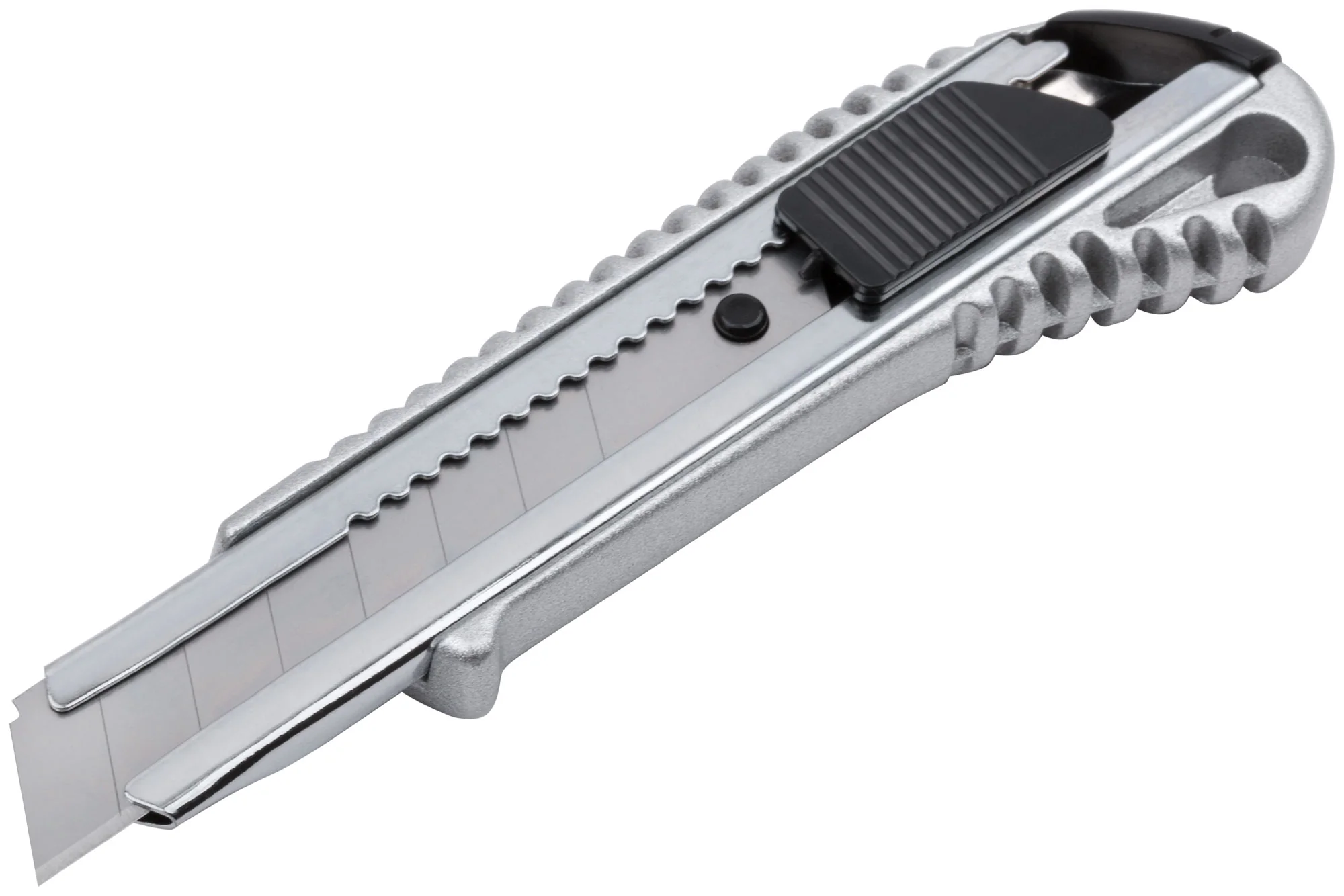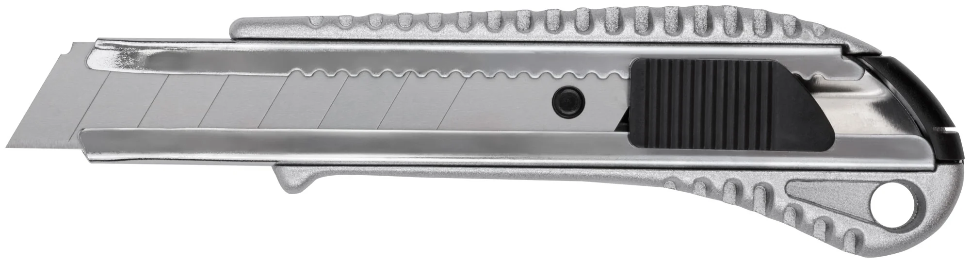 Корпус ножа выполнен из прочного металла с резиновой вставкой, что обеспечивает удобный и надежный хват, снижая риск скольжения. Сегментированное лезвие из высокоуглеродистой инструментальной стали позволяет легко обновлять режущую кромку, просто отламывая изношенные сегменты.