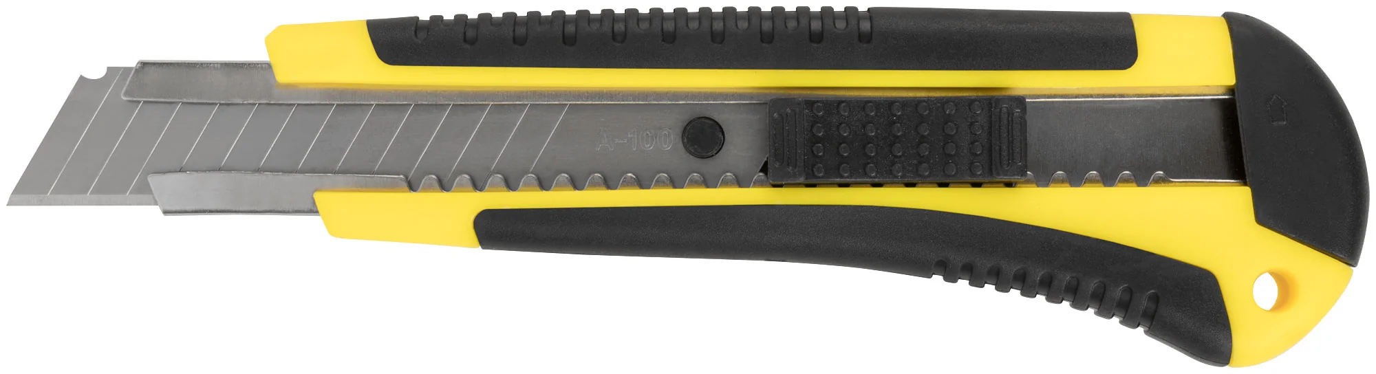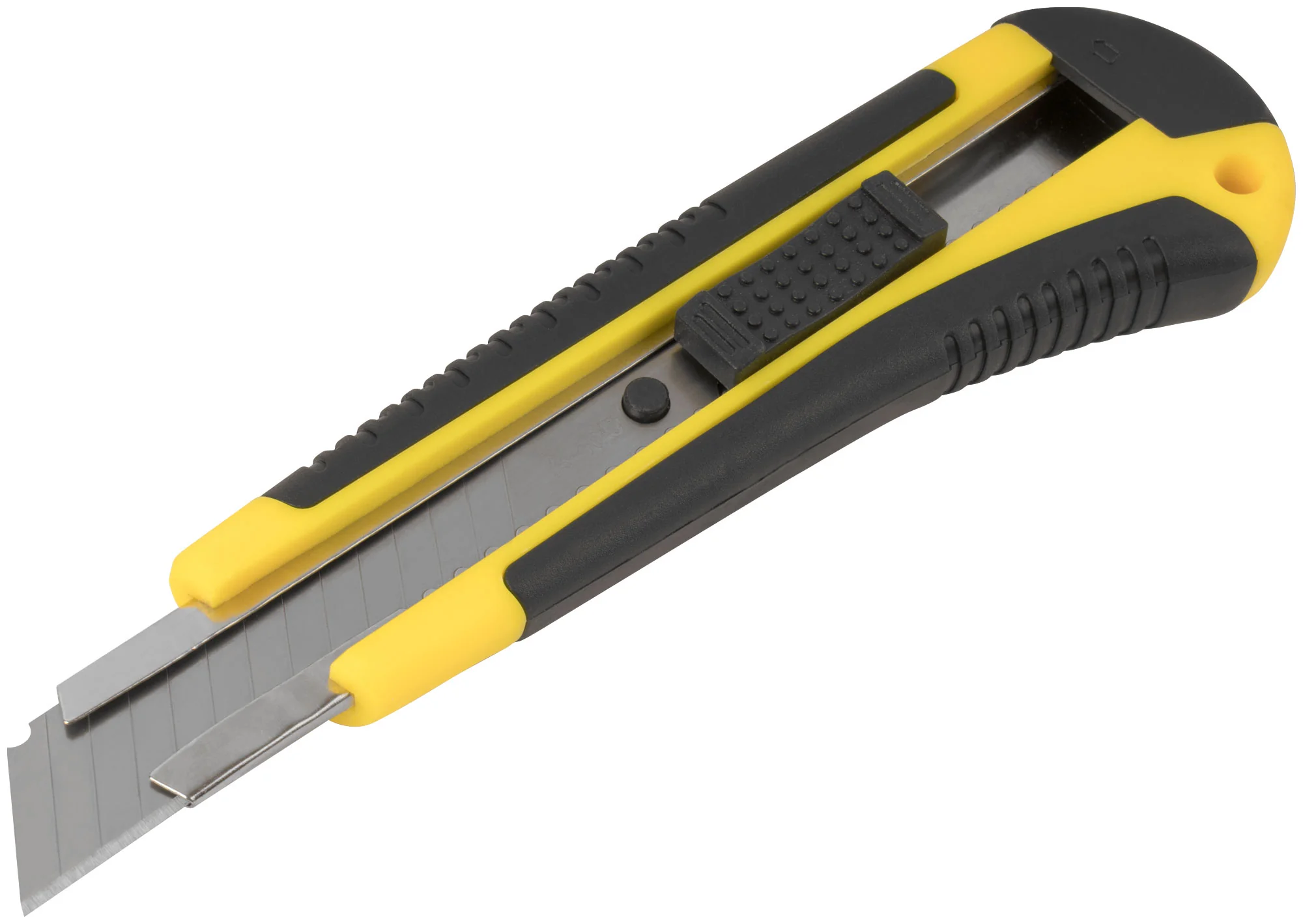 Конструкция ножа включает прорезиненный корпус, который удобно лежит в руке и предотвращает скольжение. Усиленная металлическая направляющая гарантирует устойчивость и точность в работе. Лезвие с отламывающимися сегментами позволяет быстро и без усилий обновлять режущую кромку.