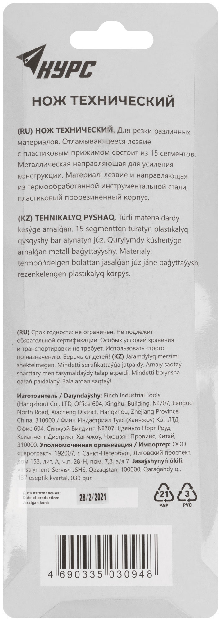 Этот технический нож от бренда "КУРС" отличается высоким качеством материалов и продуманным дизайном. Он упакован в блистер, что обеспечивает защиту и удобство при транспортировке.