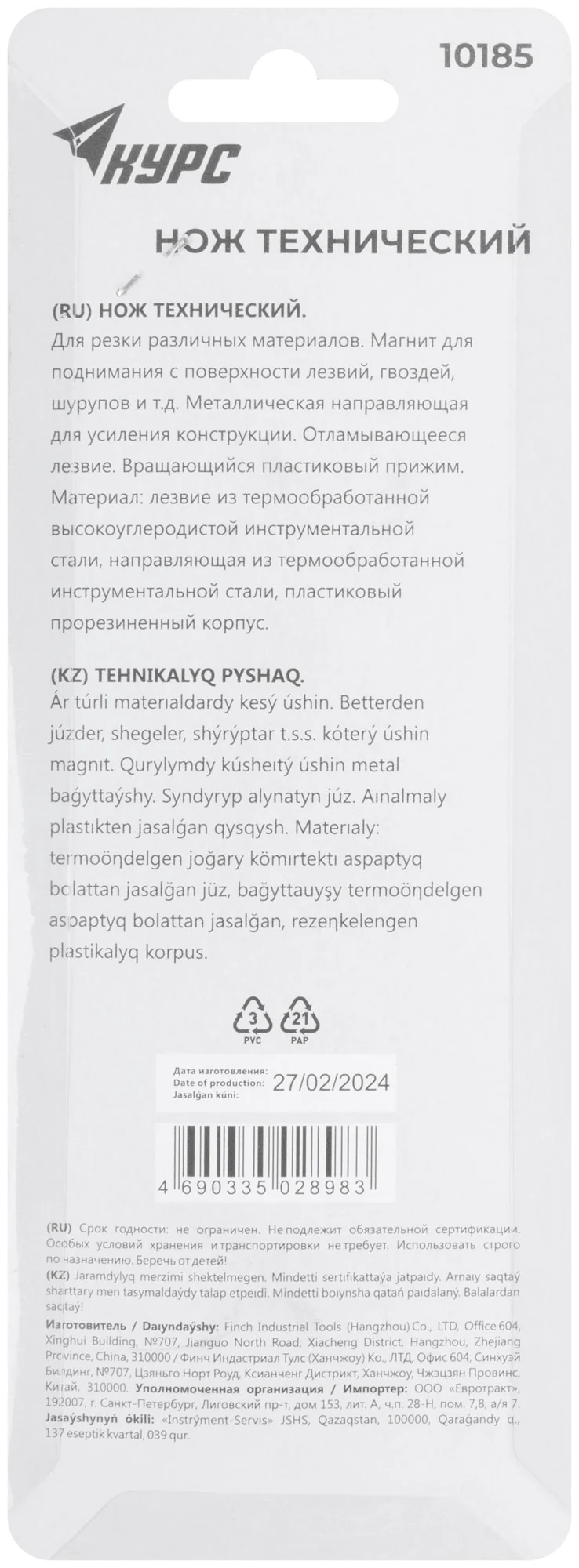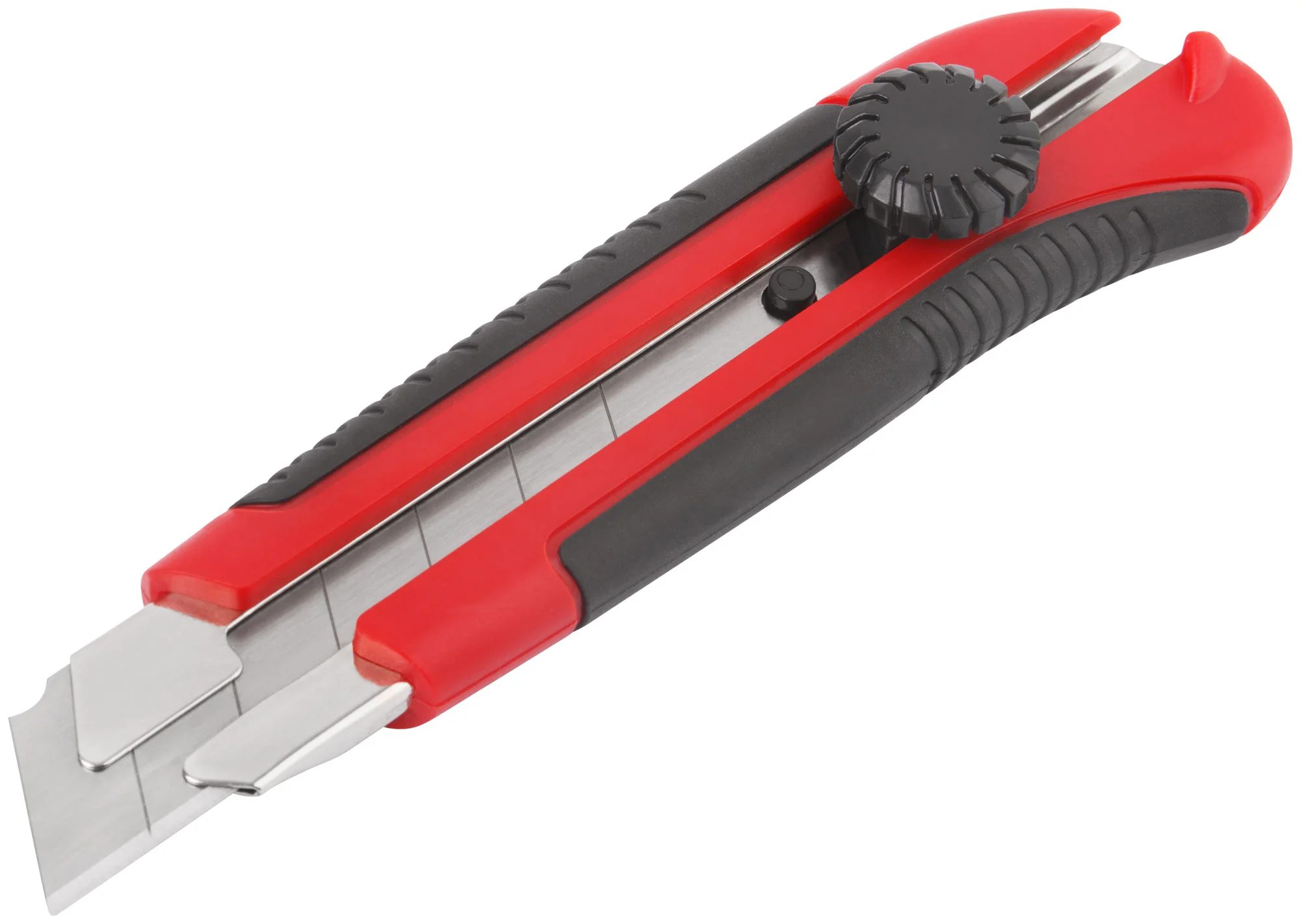 Нож оснащен сегментированным лезвием из высокоуглеродистой стали, что обеспечивает долговечность и легкость замены сегментов. Прорезиненный корпус с металлической направляющей позволяет крепко держать нож даже в сложных условиях. Вращающийся прижим облегчает фиксацию лезвия.