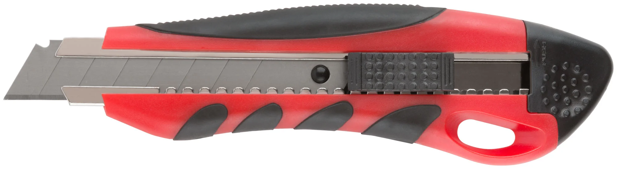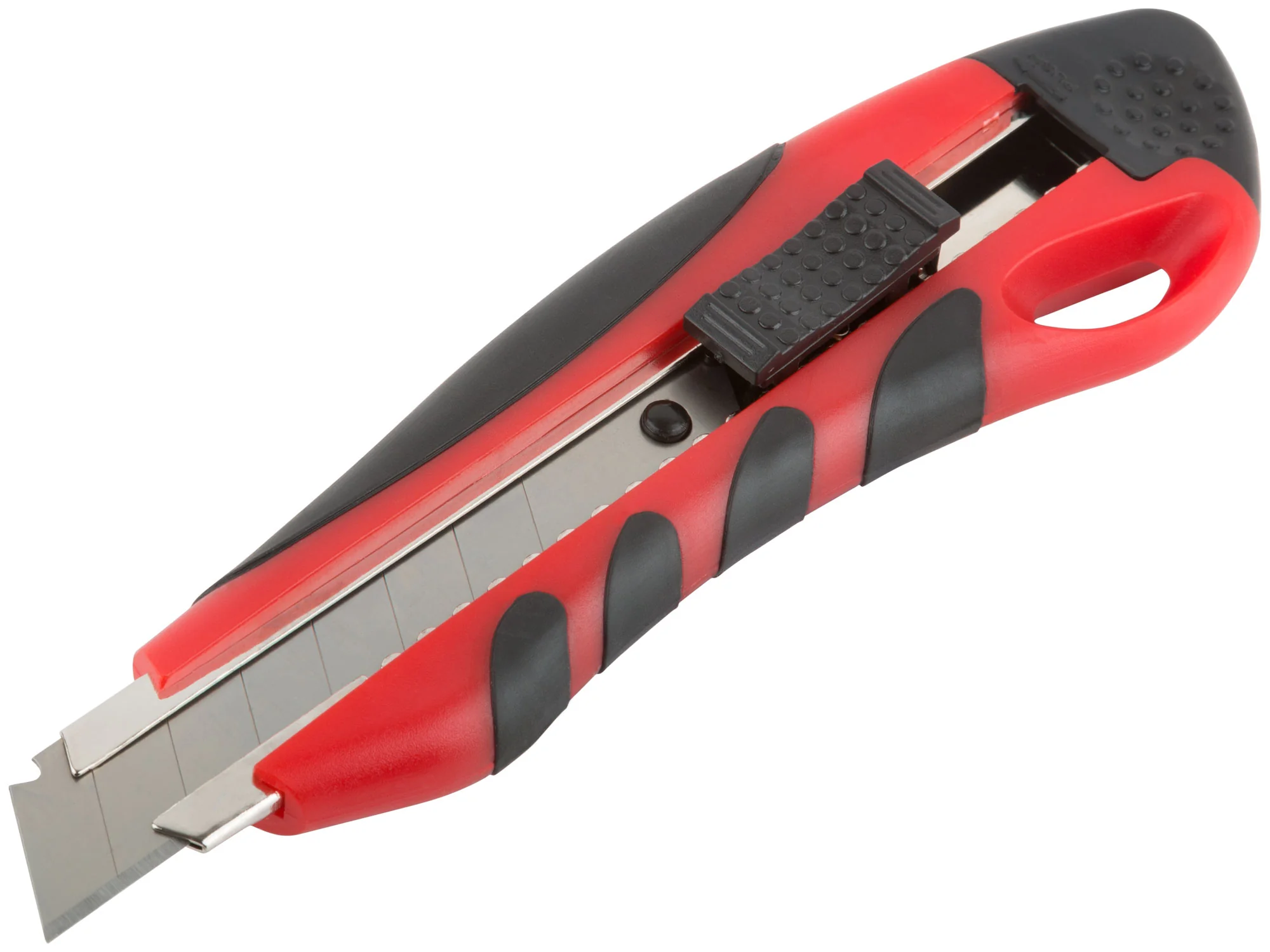 Нож оснащен сегментированным лезвием из высокоуглеродистой инструментальной стали, что обеспечивает долговечность и устойчивость к износу. Прорезиненный корпус улучшает захват, а металлическая направляющая добавляет прочности конструкции.