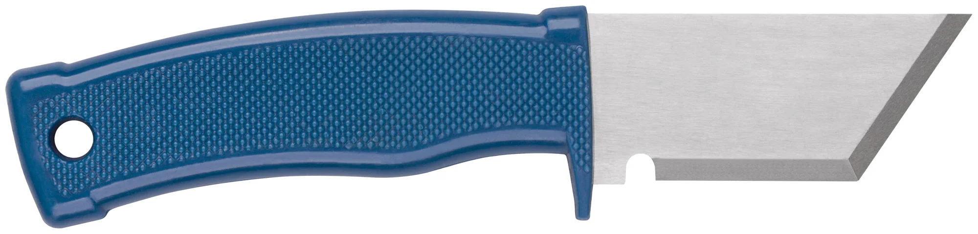Нож изготовлен с трапециевидным лезвием, которое имеет специальную выемку для удобства при заточке. Антискользящая пластиковая рукоятка обеспечивает надежный хват, что особенно важно при выполнении точных работ. Лезвие выполнено из инструментальной стали, что гарантирует долгий срок службы.