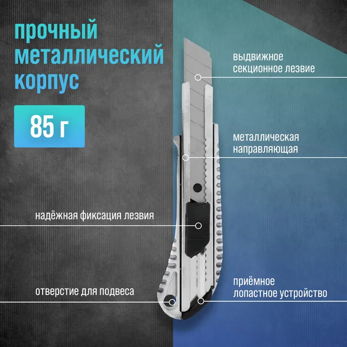 Данная модель имеет прочный корпус. Лезвие полностью задвигается внутрь, что гарантирует безопасное хранение. Если режущая поверхность затупилась, вы легко можете его поменять, отломив старый кончик по специально расчерченной линии с помощью съёмной задней части.