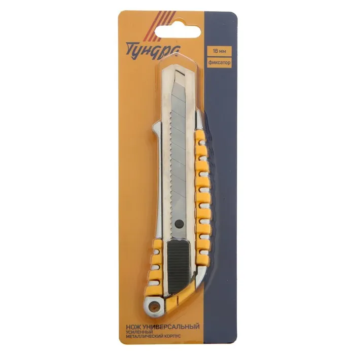 Нож универсальный ТУНДРА — отличный помощник как в строительстве и ремонте, так и в быту. Такой инструмент поможет быстро и ровно раскроить обои и напольные покрытия, вырезать различные узоры и многое другое. Эргономичная рукоятка удобно лежит в руке во время работы.