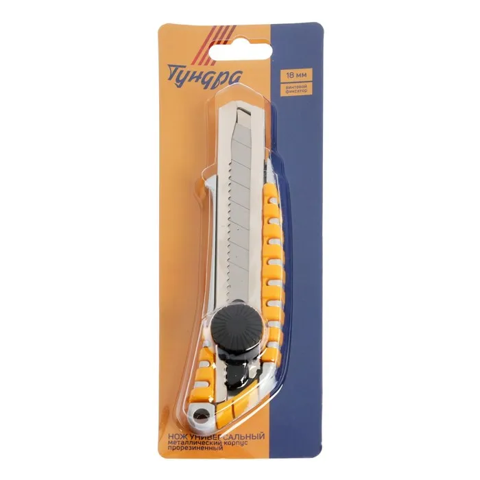 Нож универсальный ТУНДРА, прорезиненный металлический корпус, винтовой фиксатор, 18 мм