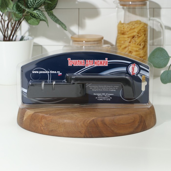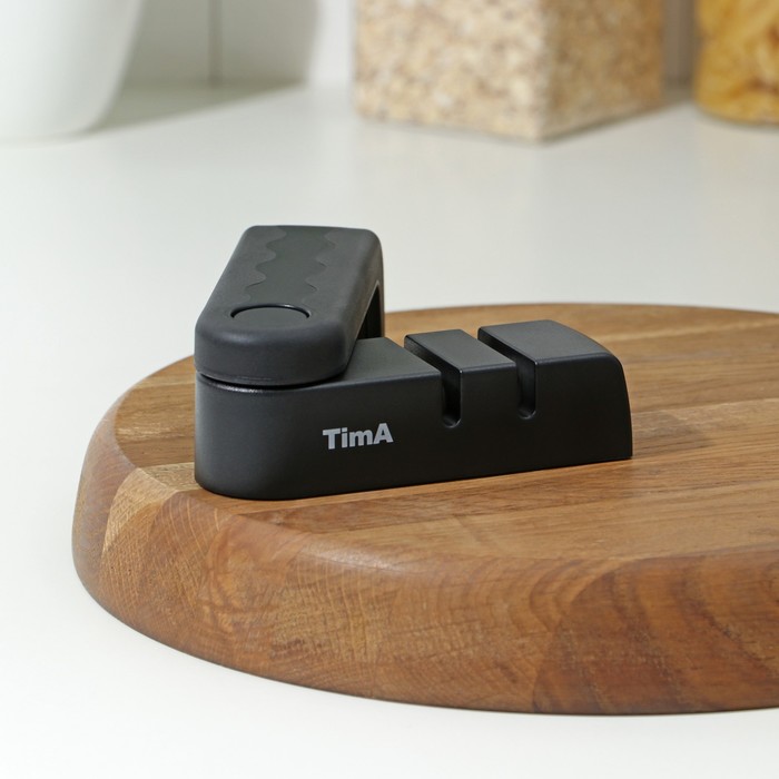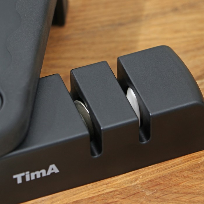 Ножеточка TimA выполнена в виде удобного держателя, сконструированного таким образом, что движение абразивных роликов происходит практически перпендикулярно режущей кромке ножа, а не вдоль, как у точилок с неподвижным камнем, благодаря чему износ (стачивание) лезвия ножа значительно меньше, а заточка намного долговечнее. Удобная точилка для ножей - незаменимый помощник на кухне хозяйки.