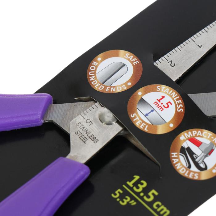 Ножницы с лезвиями из высококачественной нержавеющей стали с безопасными закругленными концами лезвий и линейкой, обеспечивающей точность резки. Не ржавеют. Ручки классической формы изготовлены из ударопрочного пластика. Товар поставляется в нескольких вариантах цвета/дизайна без возможности выбора.