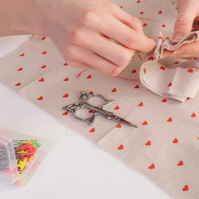 Стильные металлические ножницы с небольшими лезвиями помогут аккуратно обрезать нитки, края изделия и другие мелкие детали.