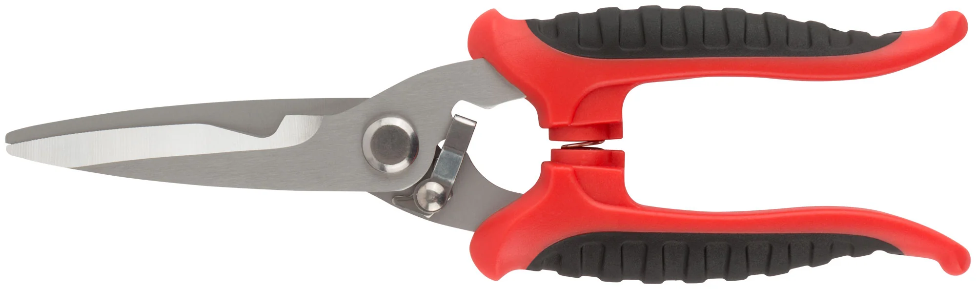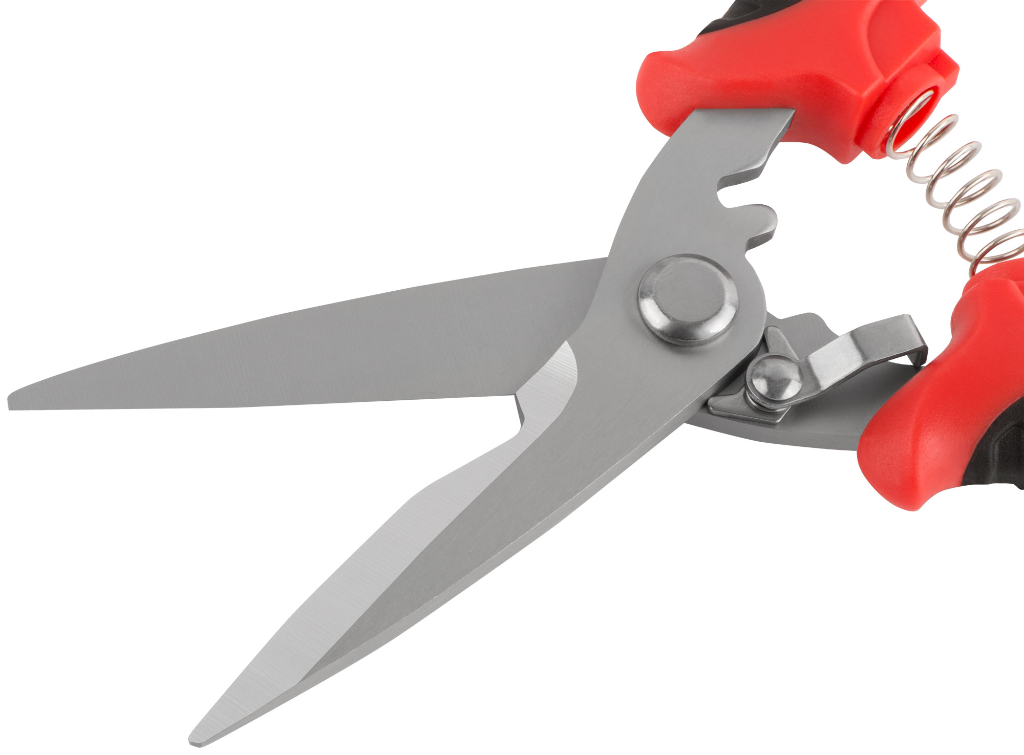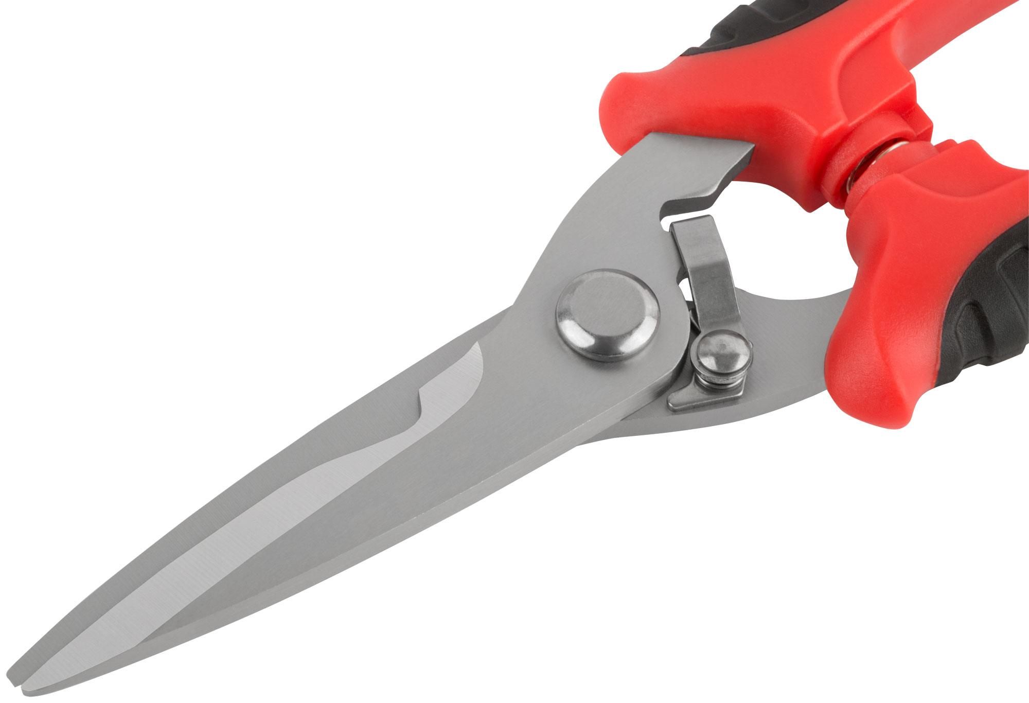 Эти ножницы оснащены специальными зубцами, предотвращающими скольжение при резке, что увеличивает точность и безопасность работы. Острое лезвие позволяет легко справляться с материалами различной толщины и плотности.