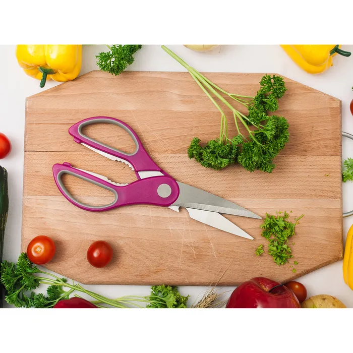 Ножницы имеют эргономичные ручки, обеспечивающие удобный и надежный захват при работе. Благодаря острым лезвиям, они легко справляются с нарезкой различных продуктов, от зелени до мяса.Ножницы легко отмываются вручную. После чистки необходимо насухо вытирать лезвия изделия.Эти кухонные ножницы станут отличным подарком для любого любителя готовить, благодаря своему стильному дизайну и высокому качеству исполнения. Они помогут ускорить и упростить процесс приготовления блюд, делая вашу кухню еще более комфортной и функциональной.