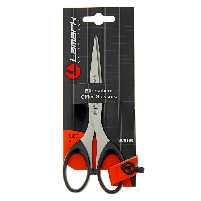 Ножницы канцелярские Lamark из нержавеющей стали. Симметричные пластиковые ручки с удобным захватом обеспечивают комфортную работу с материалами разной плотности. Размер ножниц 15,2 см. Поставляются в блистере с еврослотом.