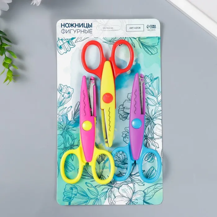 Внимание. Этот набор ножниц типа «МИКС» — конкретный цвет и узор выбрать невозможно. В одном наборе могут быть различные комбинации узоров ножниц и их цветов: три разных узора, три одинаковых, два одинаковых и один разный. То есть любые из узоров, указанных на упаковке сзади.