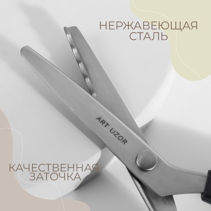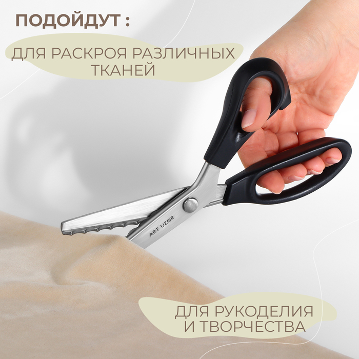 Инструмент легко режет ткань, не заминая и не деформируя её, и образует аккуратный фигурный край. Ножницы изготовлены из нержавеющей стали, имеют эргономичные пластиковые ручки.