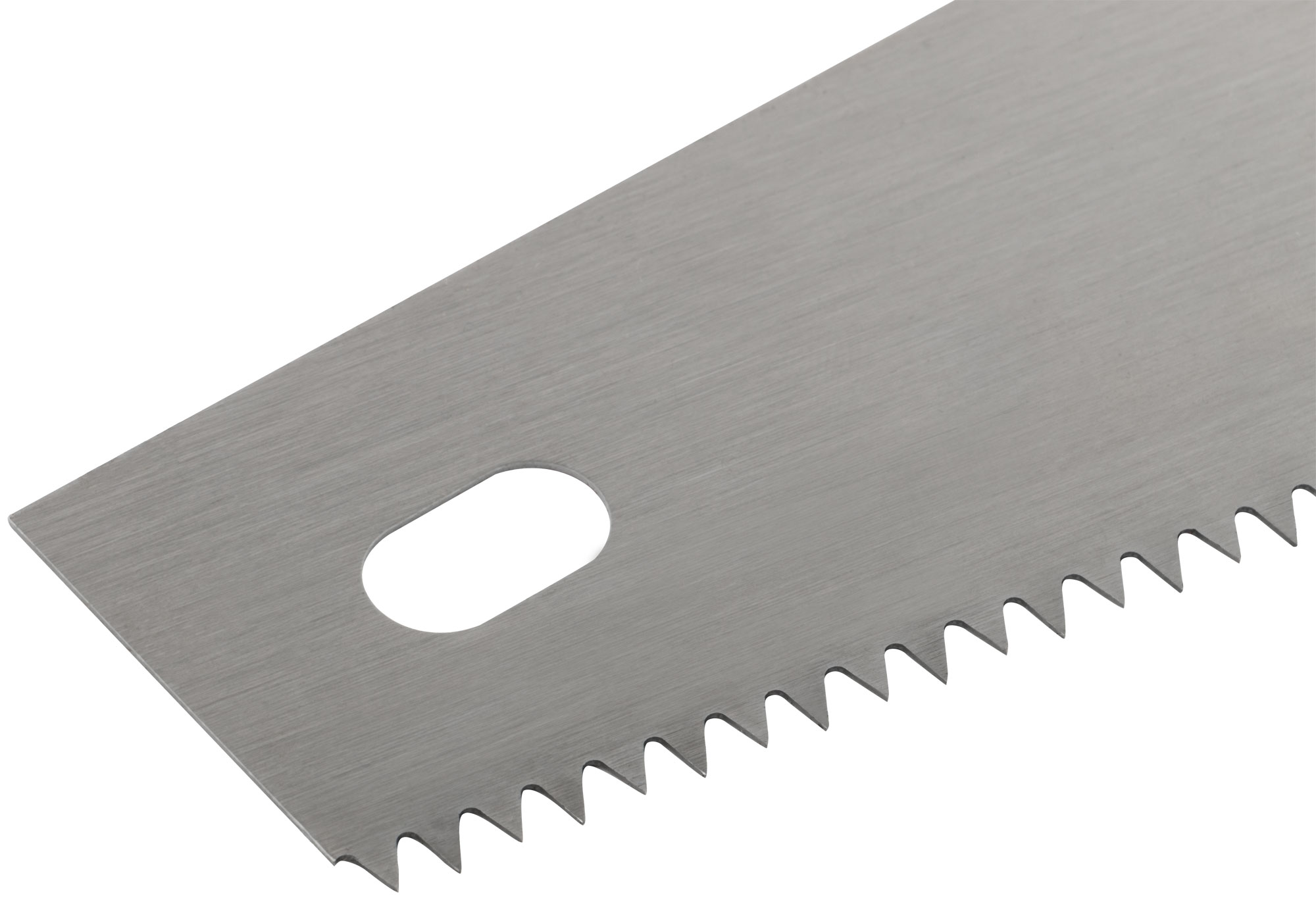 Полотно выполнено из инструментальной стали, что гарантирует долговечность и устойчивость к износу. Пластиковая рукоятка обеспечивает удобный захват, снижая утомляемость руки при длительной работе. Специальная разводка зубьев позволяет поддерживать стабильное пиление, а пластиковая планка защищает зубья при транспортировке и хранении.