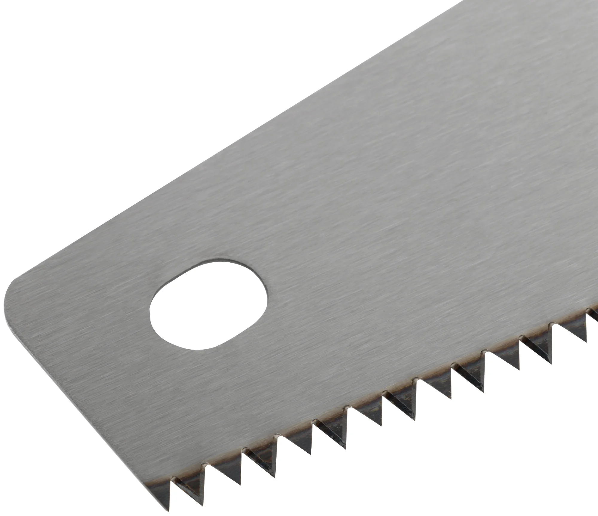 Преимущества ножовки включают высокочастотную закалку зубьев, что увеличивает срок службы инструмента и улучшает качество реза, а также эргономичную ручку, которая снижает усталость рук.