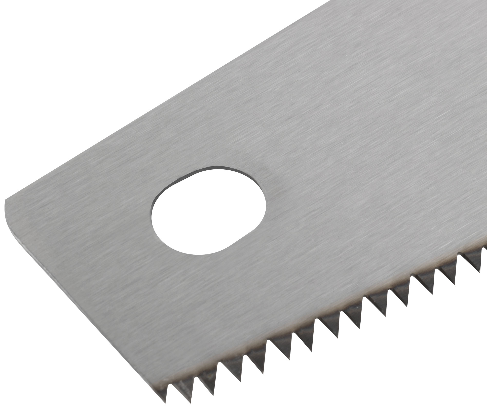 Изготовлена из высокоуглеродистой стали, ножовка оснащена зубьями с двугранной заточкой и высокочастотной закалкой, что гарантирует долговечность и высокую производительность. Пластиковая ручка с прорезиненной вставкой обеспечивает надежный и комфортный захват.