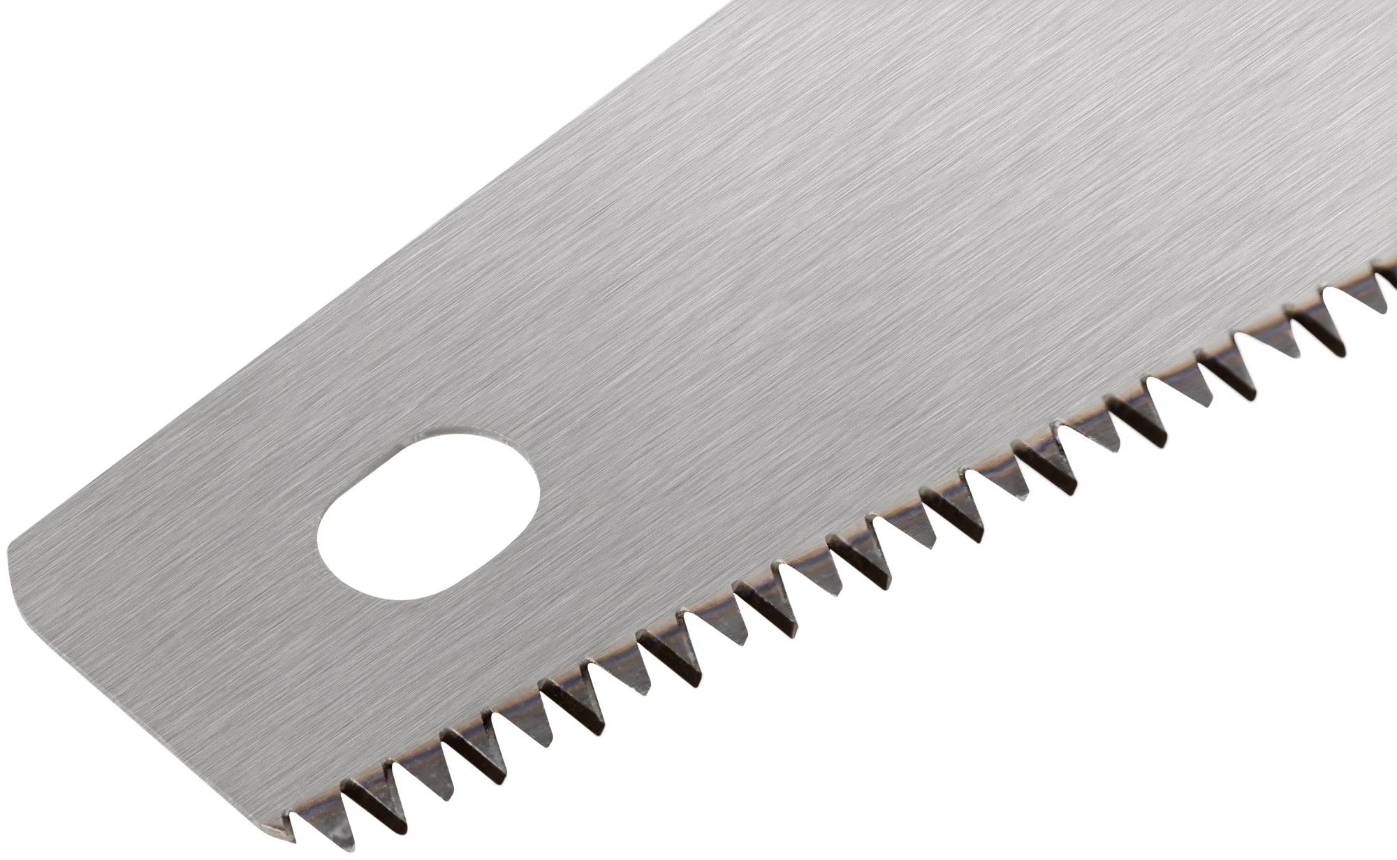 Изготовлена из высокоуглеродистой инструментальной стали, ножовка имеет средние зубья (7 TPI) с трехгранной заточкой и высокочастотной закалкой, что значительно повышает её рабочие характеристики. Прорезиненная ручка из трехкомпонентного пластика обеспечивает комфортный и надежный хват даже при длительной работе.
