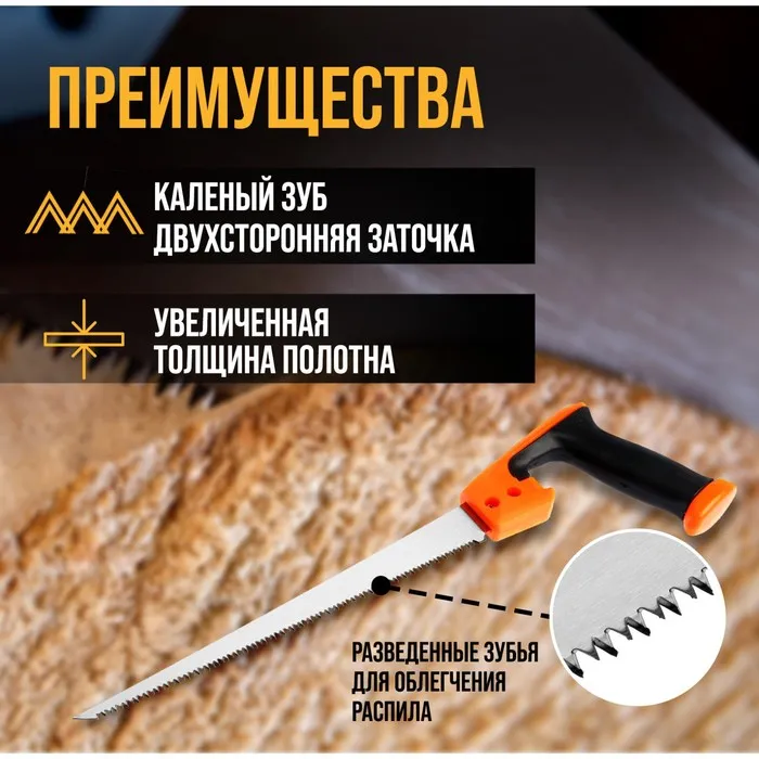 Ножовка по дереву ТУНДРА предназначена для распила средних и крупных заготовок из древесины. А удобная двухкомпонентная рукоятка обеспечивает надёжный хват и удержание инструмента во время работы.