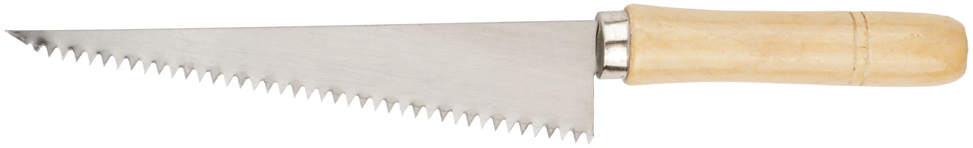 Лезвие ножовки изготовлено из инструментальной стали, что обеспечивает долгий срок службы и высокую производительность. Деревянная ручка придаёт инструменту удобство и комфорт в использовании, снижая усталость при длительной работе.