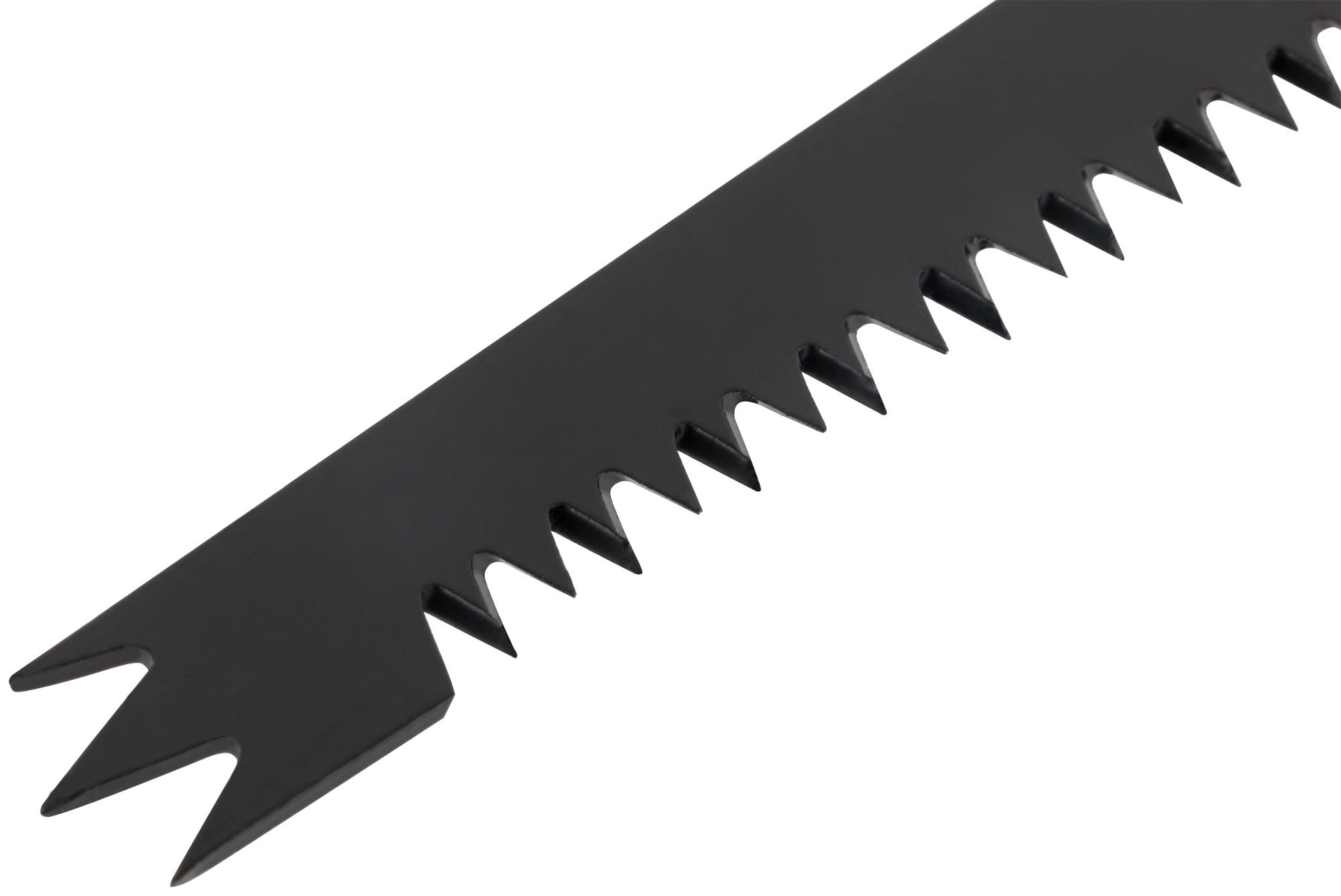 Полотно длиной 330 мм изготовлено из инструментальной стали, обладает твердостью 48 HRC и оснащено средними закаленными зубьями 7 TPI. Двухсторонняя заточка зубьев обеспечивает разнонаправленный рез, а трехгранный наконечник позволяет легко проделывать отверстия.