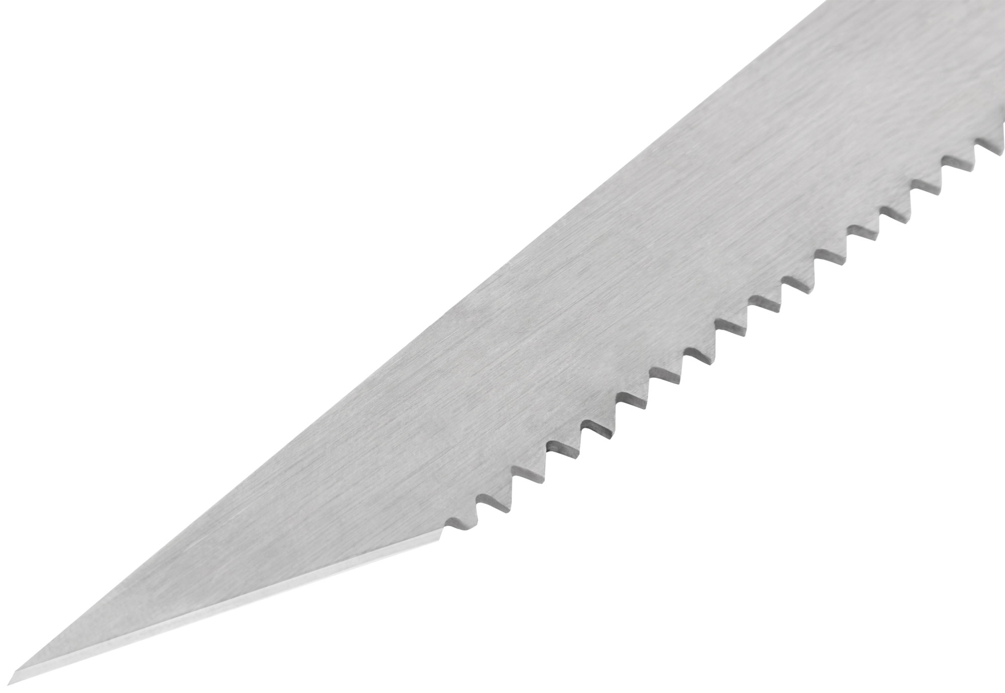 Лезвие изготовлено из высокоуглеродистой закаленной стали, что обеспечивает долгий срок службы и точность реза. Пластиковая ручка удобна в захвате, что позволяет работать длительное время без усталости.