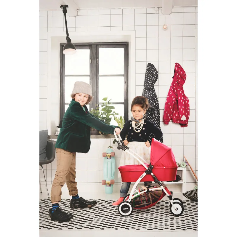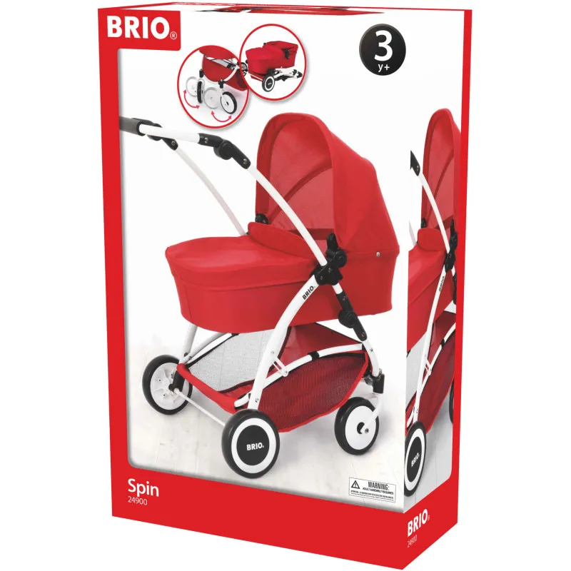 Ярко-красная коляска для кукол Brio Spin оснащена всеми современными функциями: капюшоном, корзиной для покупок, съемной люлькой, поворотными передними колесами, регулируемой ручкой и возможностью сложить коляску. Это делает её идеальным выбором для маленьких любителей игр.
