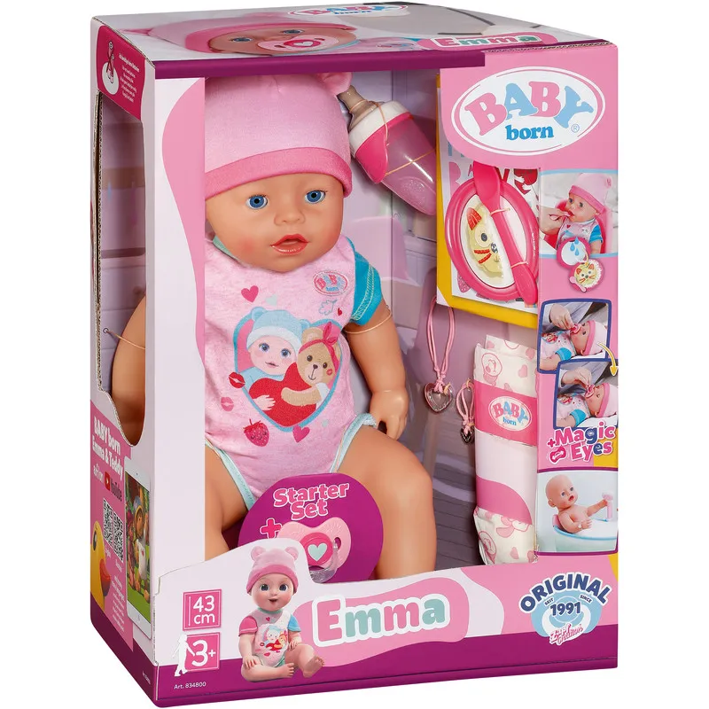 Кукла Baby Born Emma – это практически как настоящий младенец: её можно купать, поить, и она плачет настоящими слезами. Кукла закрывает глаза, когда вы вращаете соску в её рту.