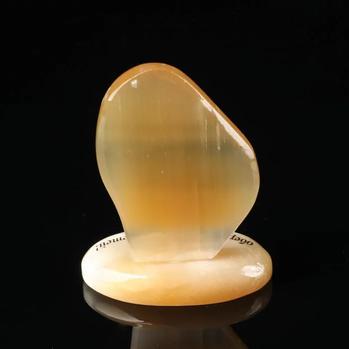 Селенит — это материал, который относится к разновидности гипса, жёлто-розового цвета с шелковистым блеском. Внутренние волокна расположены плотно, это даёт эффект «кошачьего глаза». Изделия из селенита завораживают игрой света, нежными тонами и хрупкостью. При прикосновении есть ощущение исходящей энергии.