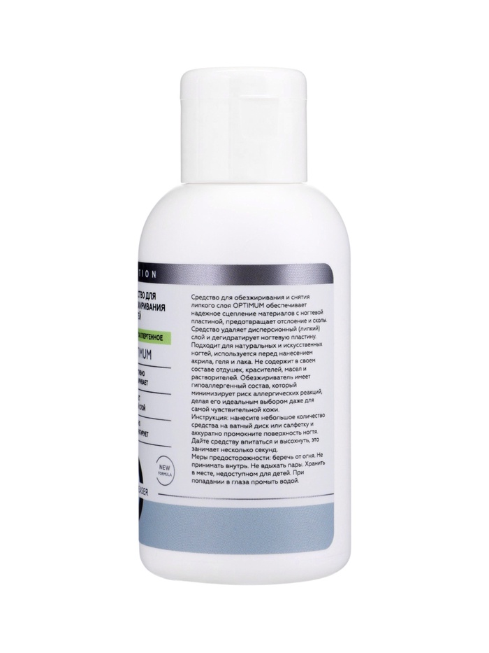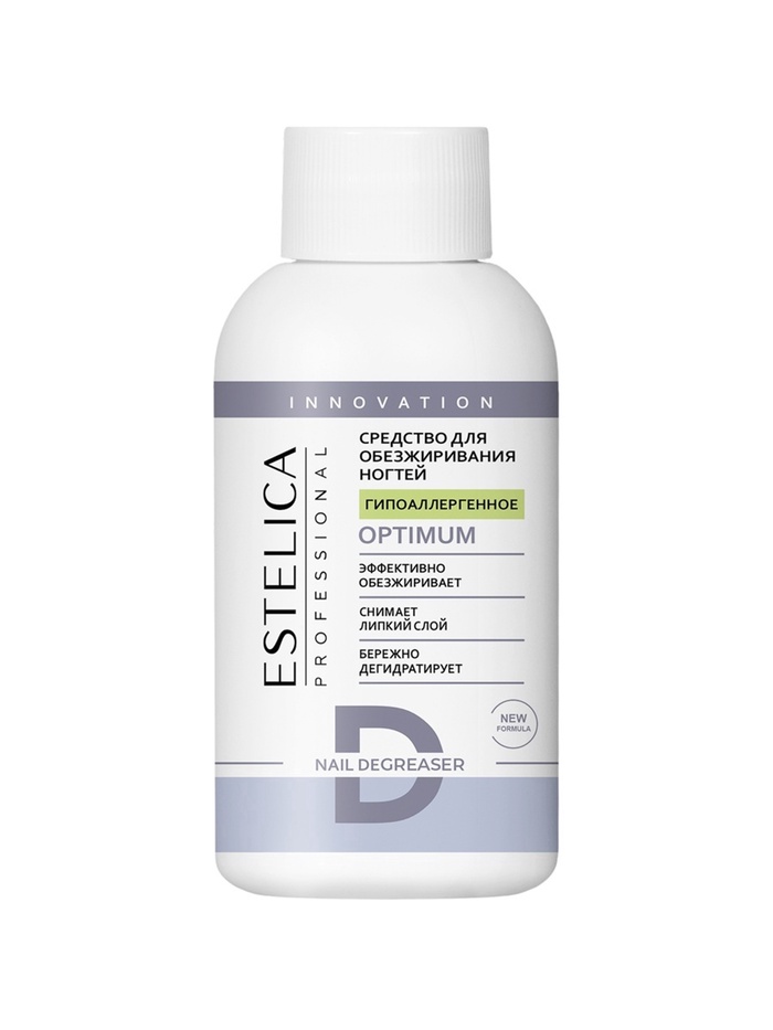 ESTELICA PROFESSIONAL OPTIMUM, средство для обезжиривания и снятия липкого слоя 100 мл — профессиональное гипоаллергенное средство, которое обеспечивает надёжное сцепление материалов с ногтевой пластиной и предотвращает сколы и отслоения покрытия. Средство эффективно удаляет дисперсионный (липкий) слой и дегидратирует ногтевую пластину, что делает его незаменимым при работе с натуральными и искусственными ногтями перед нанесением акрила, геля или лака.