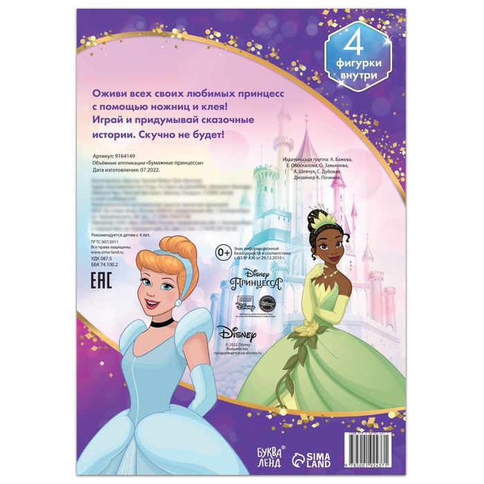 Объёмные аппликации «Бумажные принцессы», А4, 4 фигурки, Дисней — Характеристики