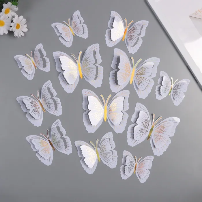 Наклейка пластик "Бабочки белые с золотом" двойные крылья набор 12 шт 12 см, 10 см 8 см