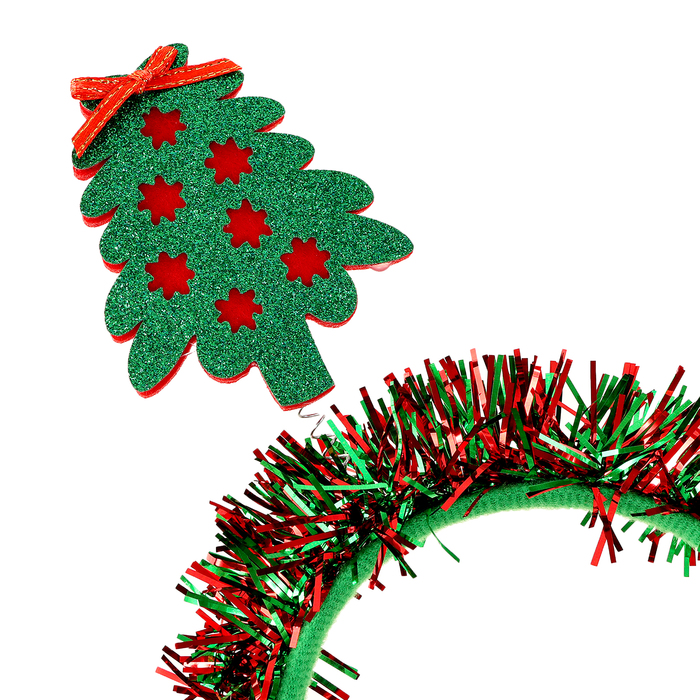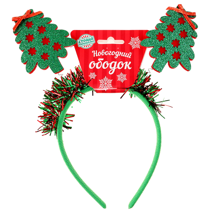 - Ободок украшен двумя объемными мягкими елочками, покрытыми блёстками. Елочки имеют классическую форму и украшены звездами