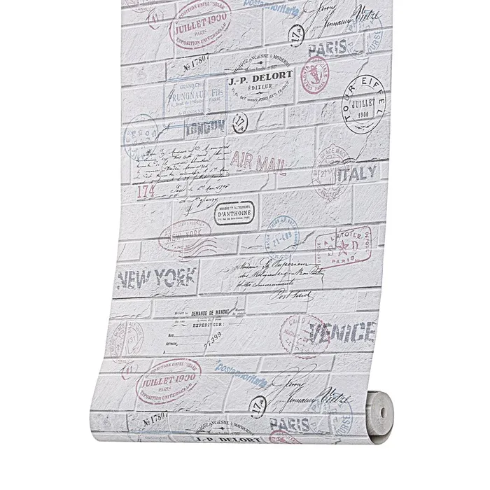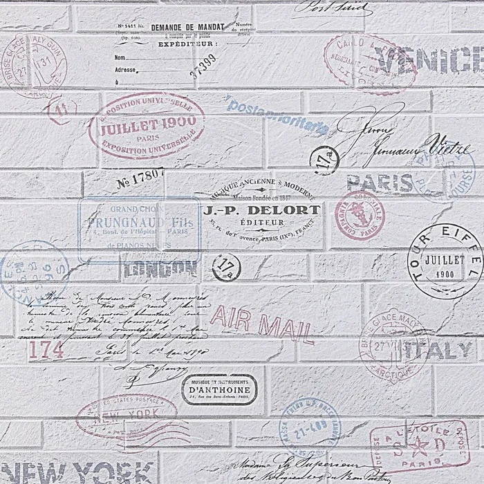 Обои бумажные "Турне" с изображением светлого кирпича и надписей