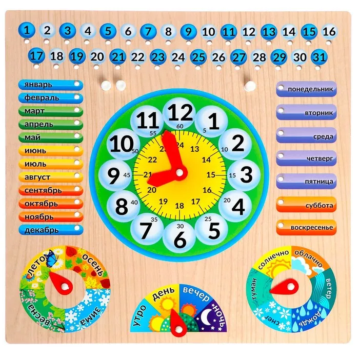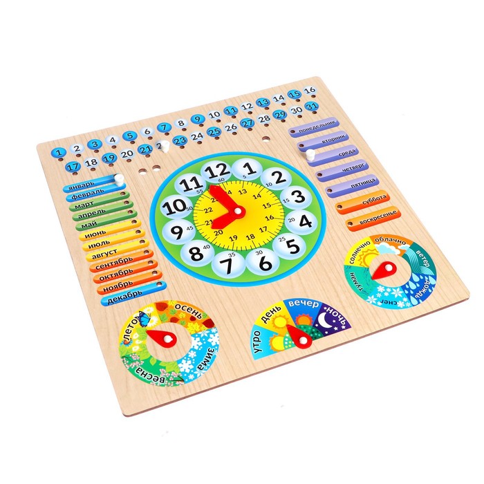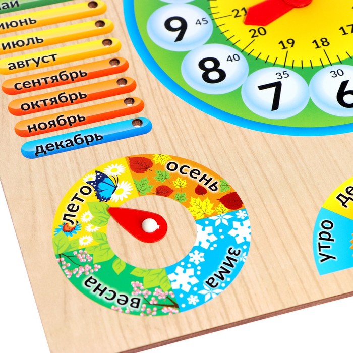 Красочный деревянный планшет оснащен подвижными стрелками и съёмными пластиковыми указателями. Планшет поделён на зоны, каждая из которых помогает ребёнку узнать о различных аспектах времени — от дня недели до времени года. Выбор в каждой зоне легко фиксируется стрелками или пластиковыми элементами, вставляемыми в специальные пазы.