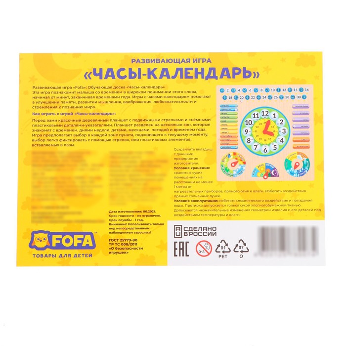 Изучение времени становится увлекательным с этим многофункциональным обучающим часами-календарём! Размеры изделия составляют 285x285x5 мм, а количество элементов — всего 4.