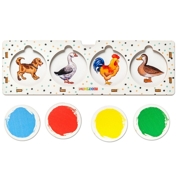 Игра «Цветные окошки». Вставьте в игровой планшет карточку с изображением коровы, лошади, медведя и козы. Попросите ребёнка закрыть, например, козу синим кружочком, медведя – красным, корову – зелёным, лошадь – жёлтым. Усложните игру, попросив закрыть козу, например, не синим и не жёлтым кружочком.