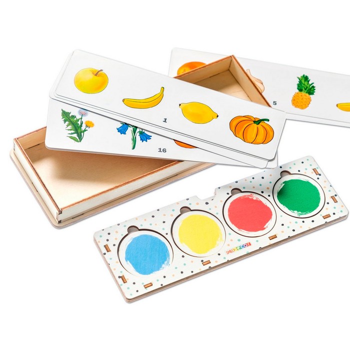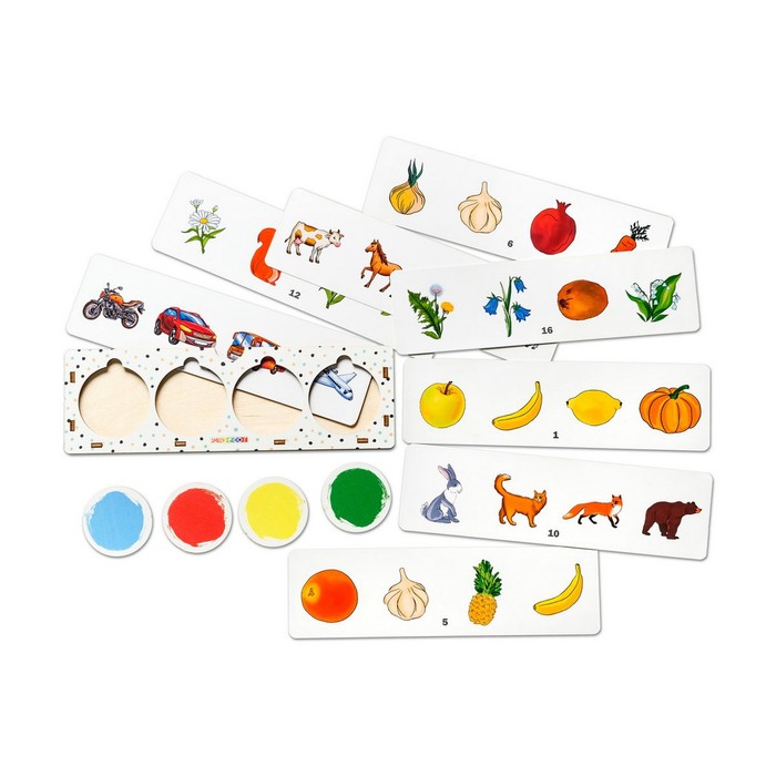 Игра «Прятки». Рассмотрите игровой планшет вместе с ребёнком. Обратите внимание на круглые «окошки», посчитайте их количество и назовите цвет каждого из них. Выберите любую карточку с картинками и вставьте её в игровой планшет. Расскажите, что в окошках прячутся предметы, рассмотрите все изображения и попросите закрыть кружочком окошко с названным вами предметом.
