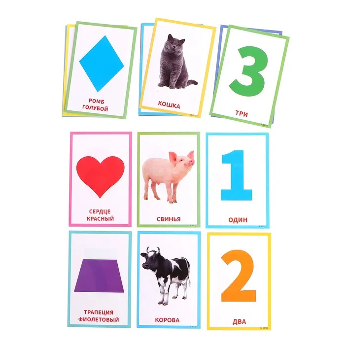 Ребёнок познакомится с цифрами от 1 до 10, выучит геометрические формы и основные цвета, споёт весёлые песенки и запомнит названия всех животных. В комплект входит 15 двусторонних карточек для развития малыша по методике Г. Домана.