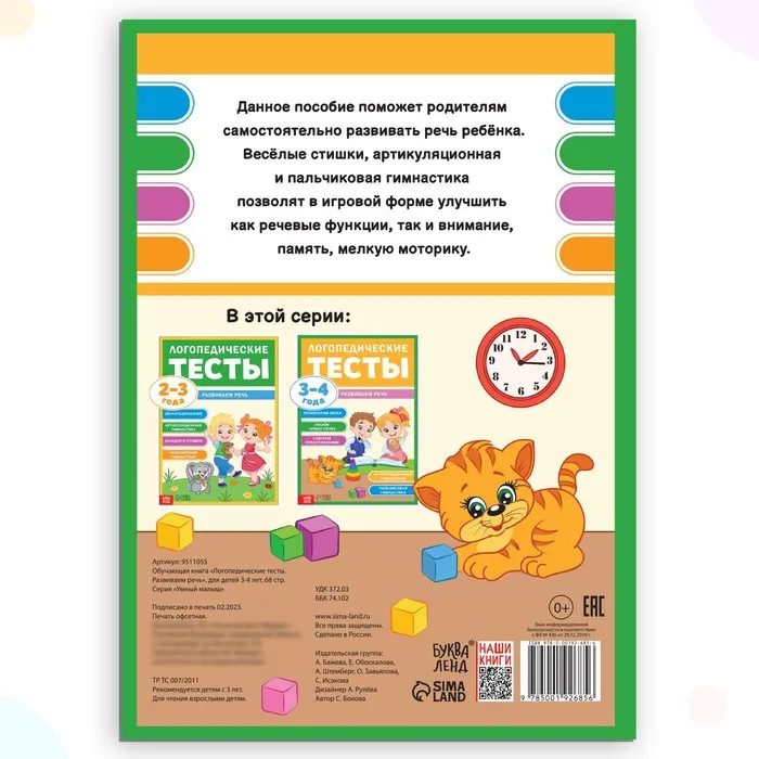 Обучающая книга «Логопедические тесты. Развиваем речь», для детей 3-4 лет, 68 стр. — Характеристики