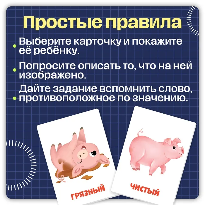 Обучающие карточки «Первые слова. Противоположности» помогут вашему малышу изучить важные базовые понятия через игру. Карточки идеально подходят для детей от 3 лет, способствуя развитию речи, воображения и познавательных навыков. Набор станет полезным инструментом в обучении дома или на занятиях с педагогами.