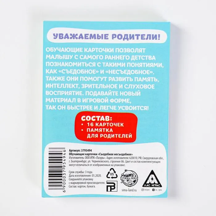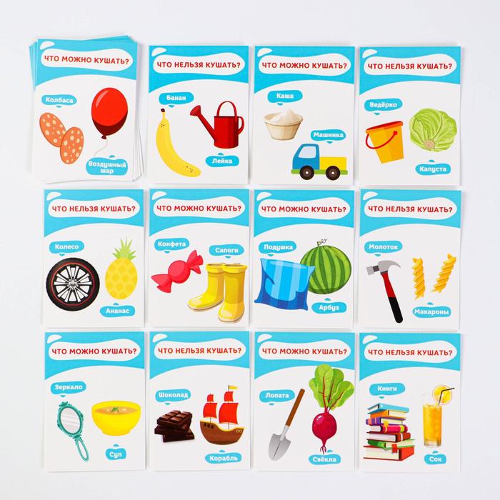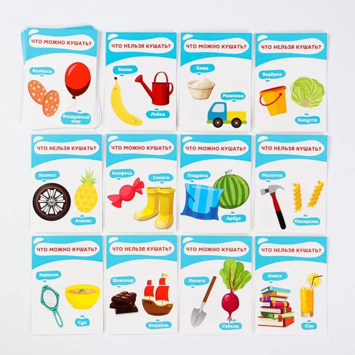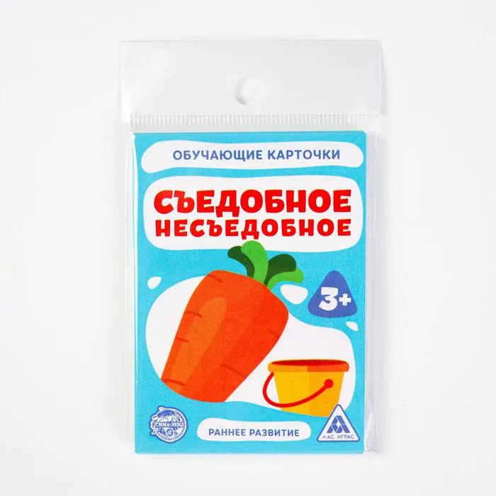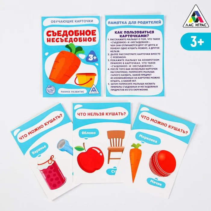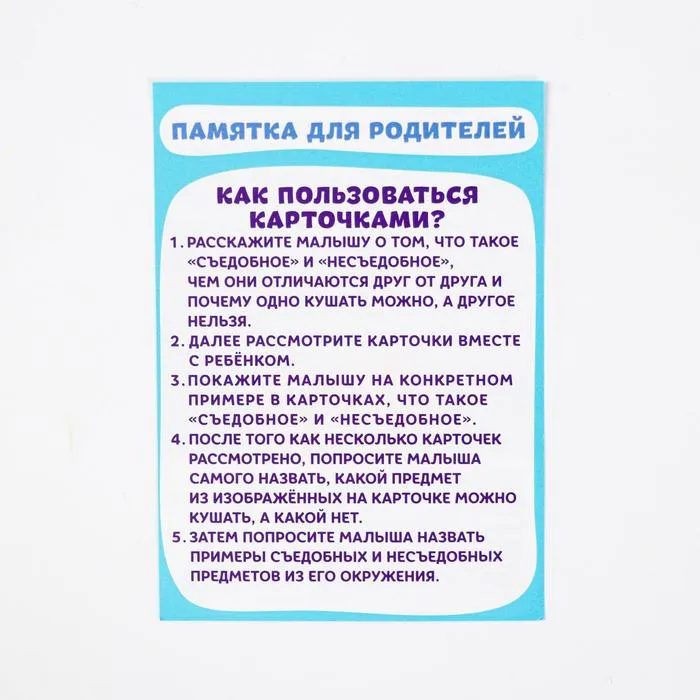 Обучающие карточки позволят малышу с самого раннего детства познакомиться с понятиями «съедобное» и «несъедобное». Также они помогут развить память, интеллект, зрительное и слуховое восприятие.