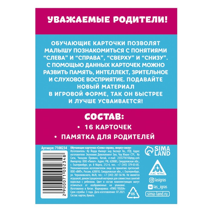 Обучающие карточки «Слева-справа, сверху-снизу», 16 карт, 3+ — Характеристики